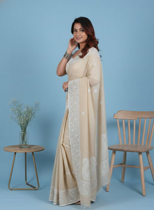 Aparajita Beige - Aks Kota Cotton Chikankari Saree