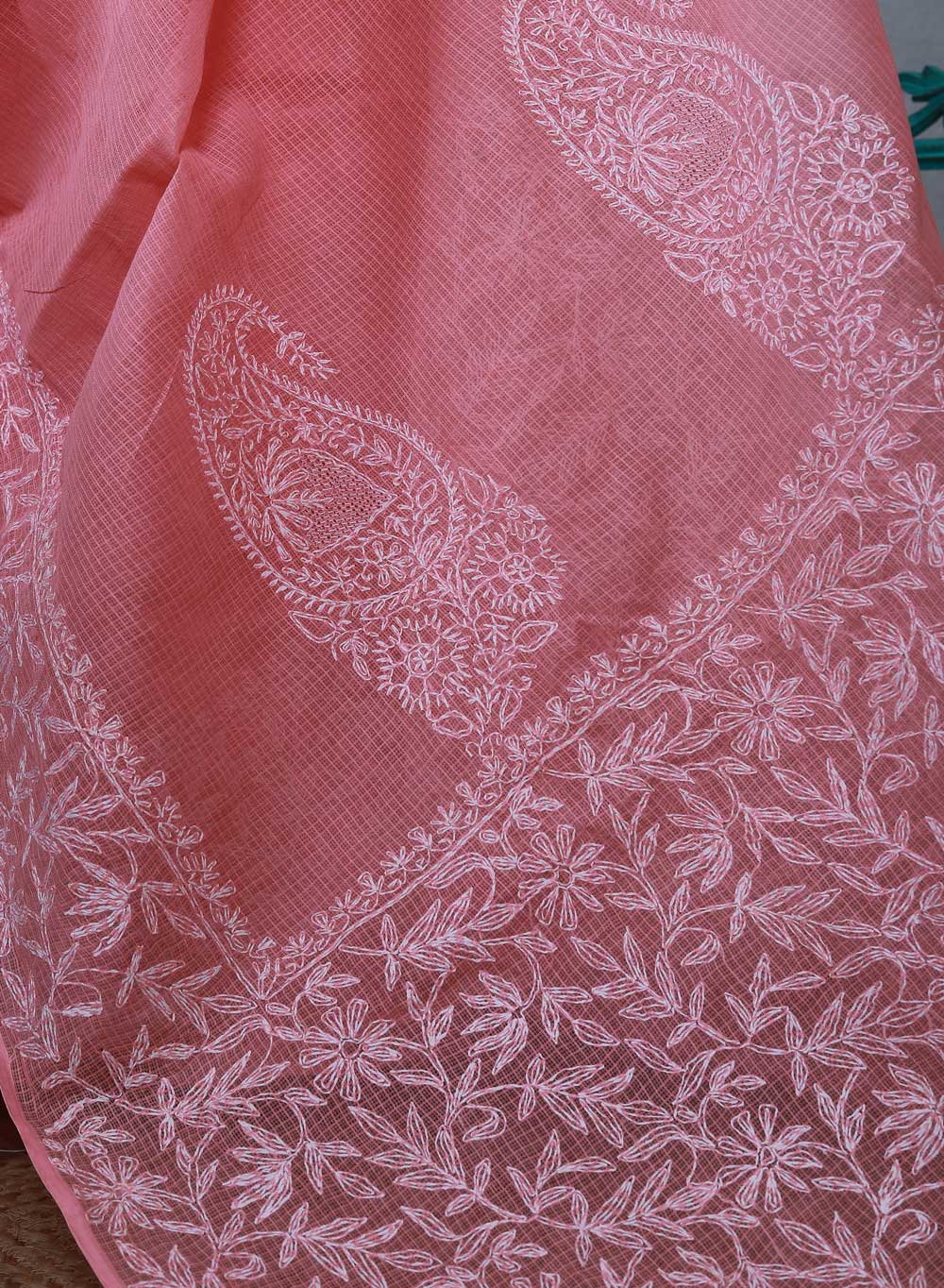 Inspired by the delicate feel of Lucknowi heritage, the floral embroidery in twisted self cotton thread is placed as if considered around an early morning landscape.