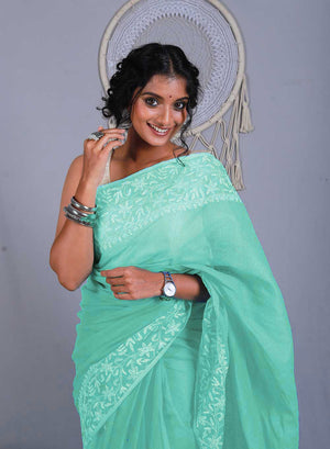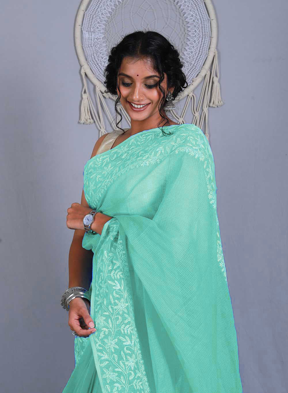 Aparajita Turquoise - Aks Kota Cotton Chikankari Saree