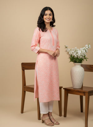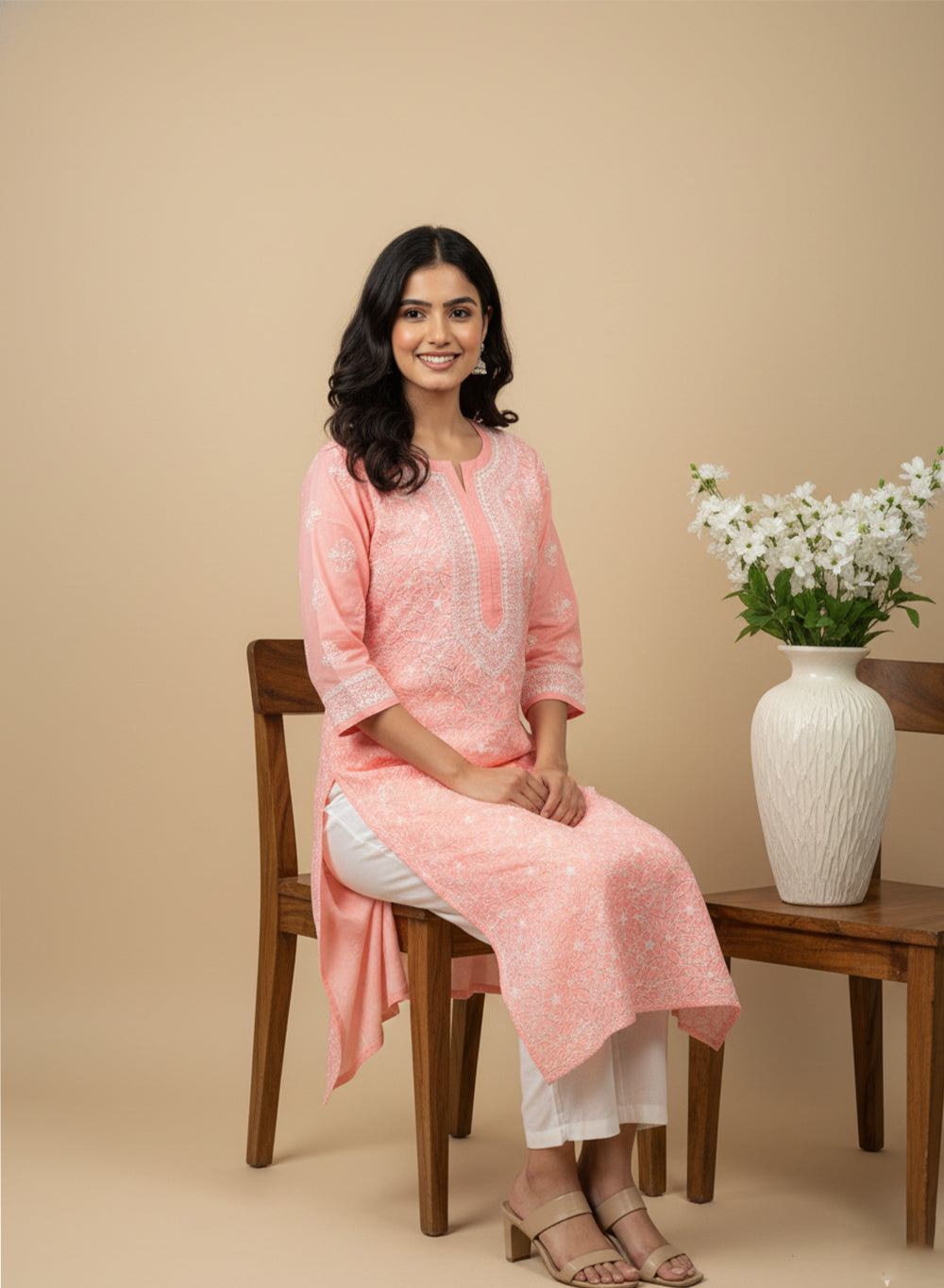 Our beautiful Baby Pink - Bahaar Cotton Terry Voile Chikankari Kurta With White Thread Embroidery, has been hand embroidered with twisted cotton thread.
