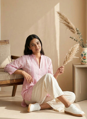 Baby Pink - Gulshan Mul Chanderi Chikankari Short Top