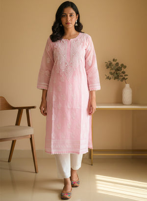 Baby Pink With Crochet Lace - Cotton Terry Voile Bahaar Chikankari Kurta With Slip
