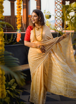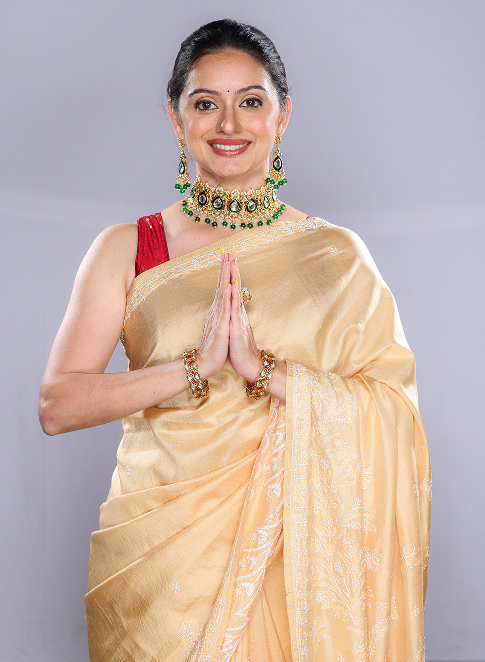 Inspired by the delicate feel of Lucknowi Chikankari our Beige Pure Tussar Silk Saree has been painstakingly hand embroidered with multicolored resham dhaaga.