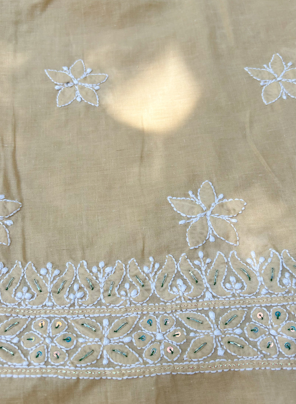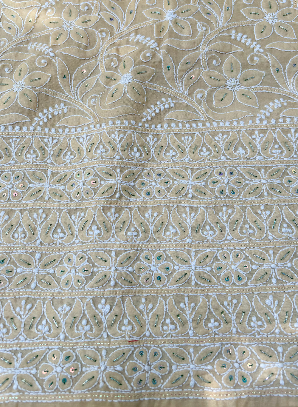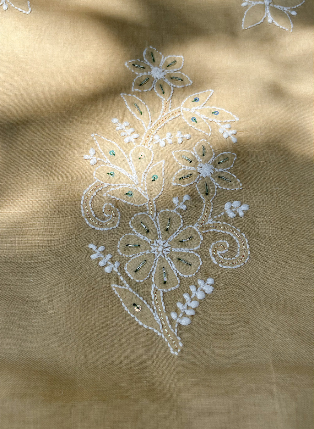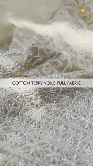 This one of a kind, beautiful beige cotton terry voile unstitched kurta and salwar fabric, has been lovingly hand embroidered by our karigars and then embellished with beige and green katdana, aari work and sequins embellishments.