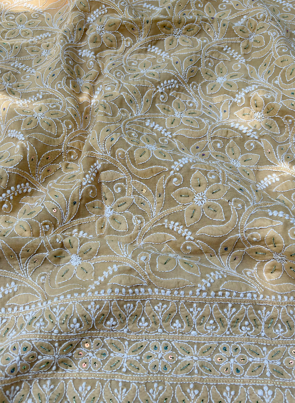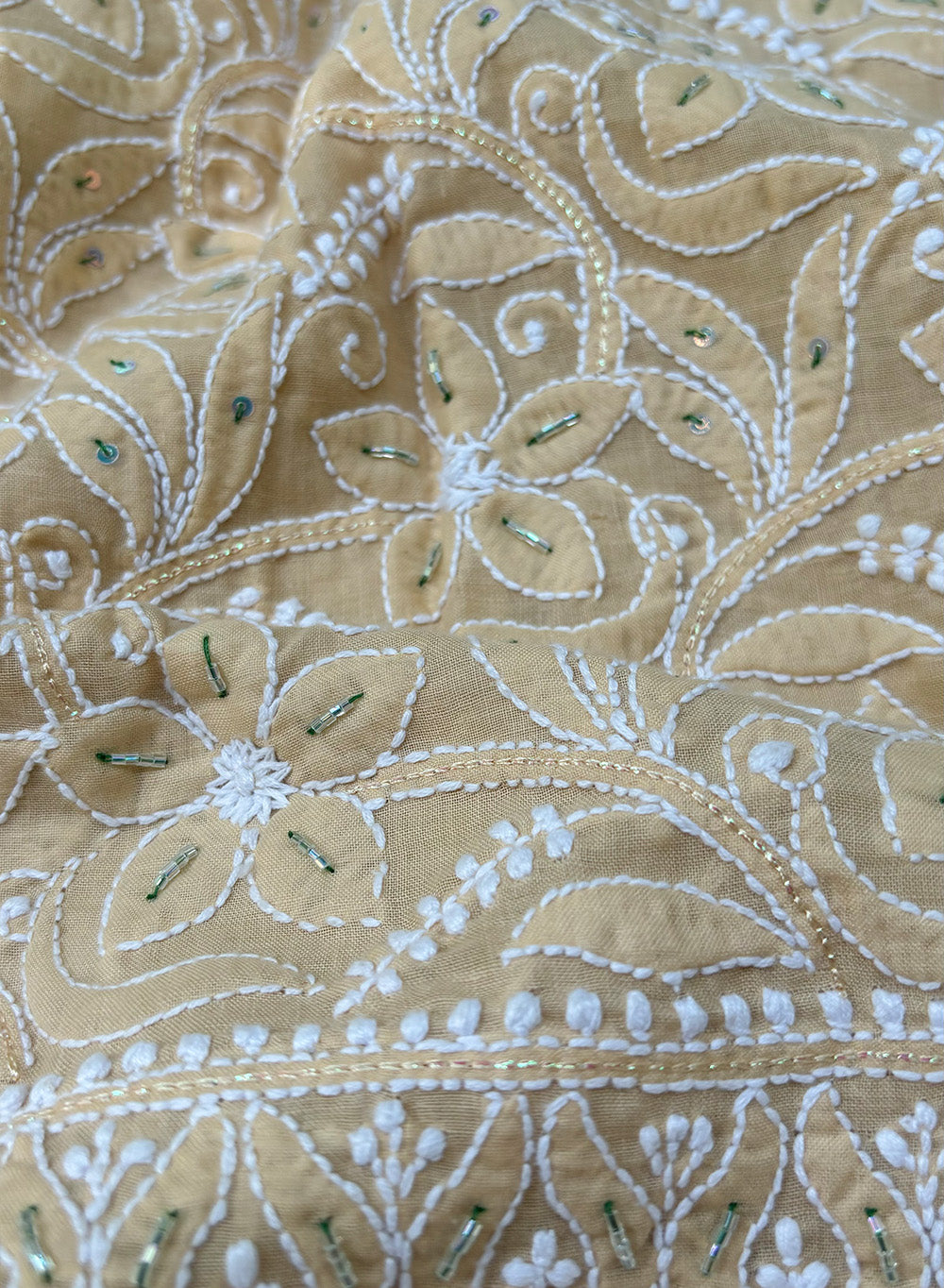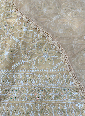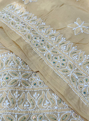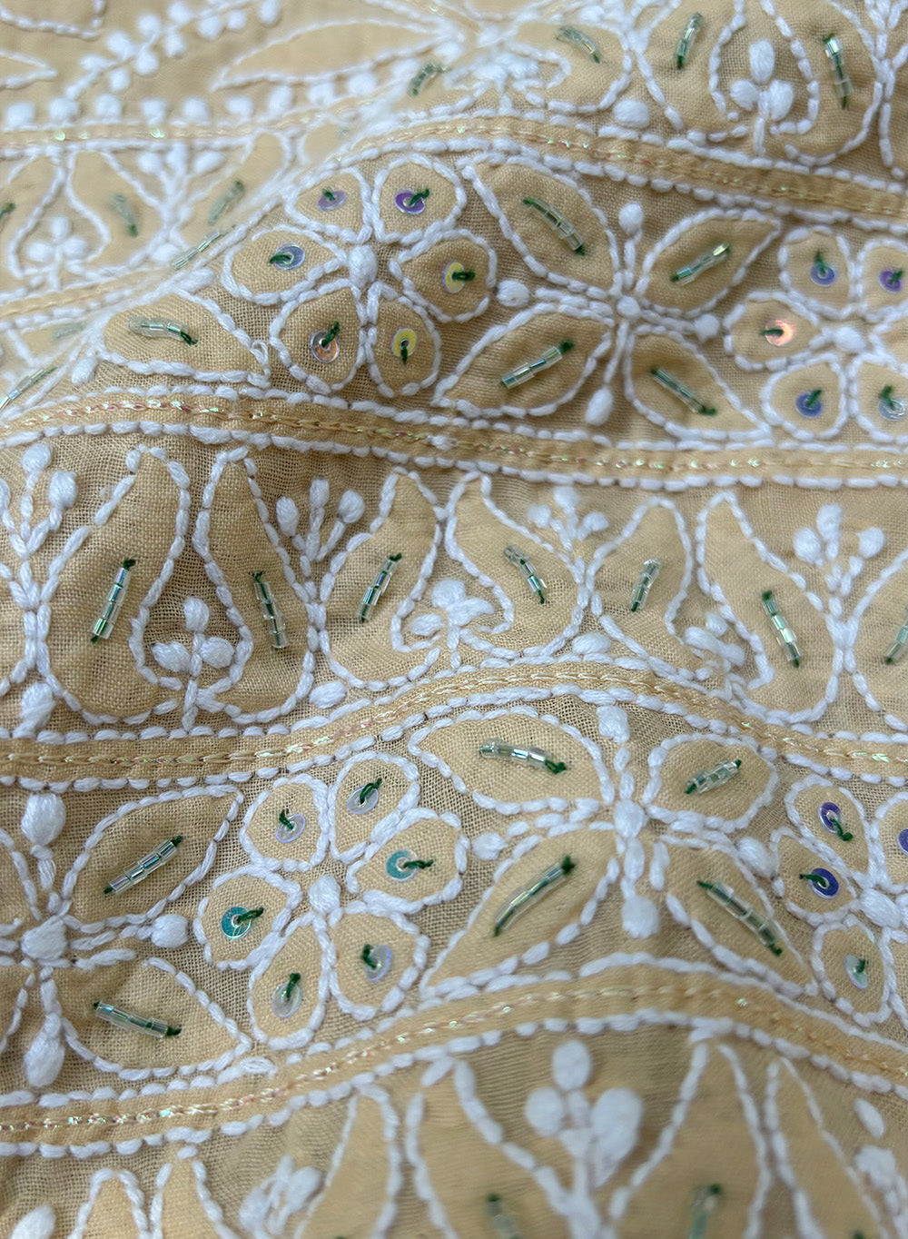 This one of a kind, beautiful beige cotton terry voile unstitched kurta and salwar fabric, has been lovingly hand embroidered by our karigars and then embellished with beige and green katdana, aari work and sequins embellishments.