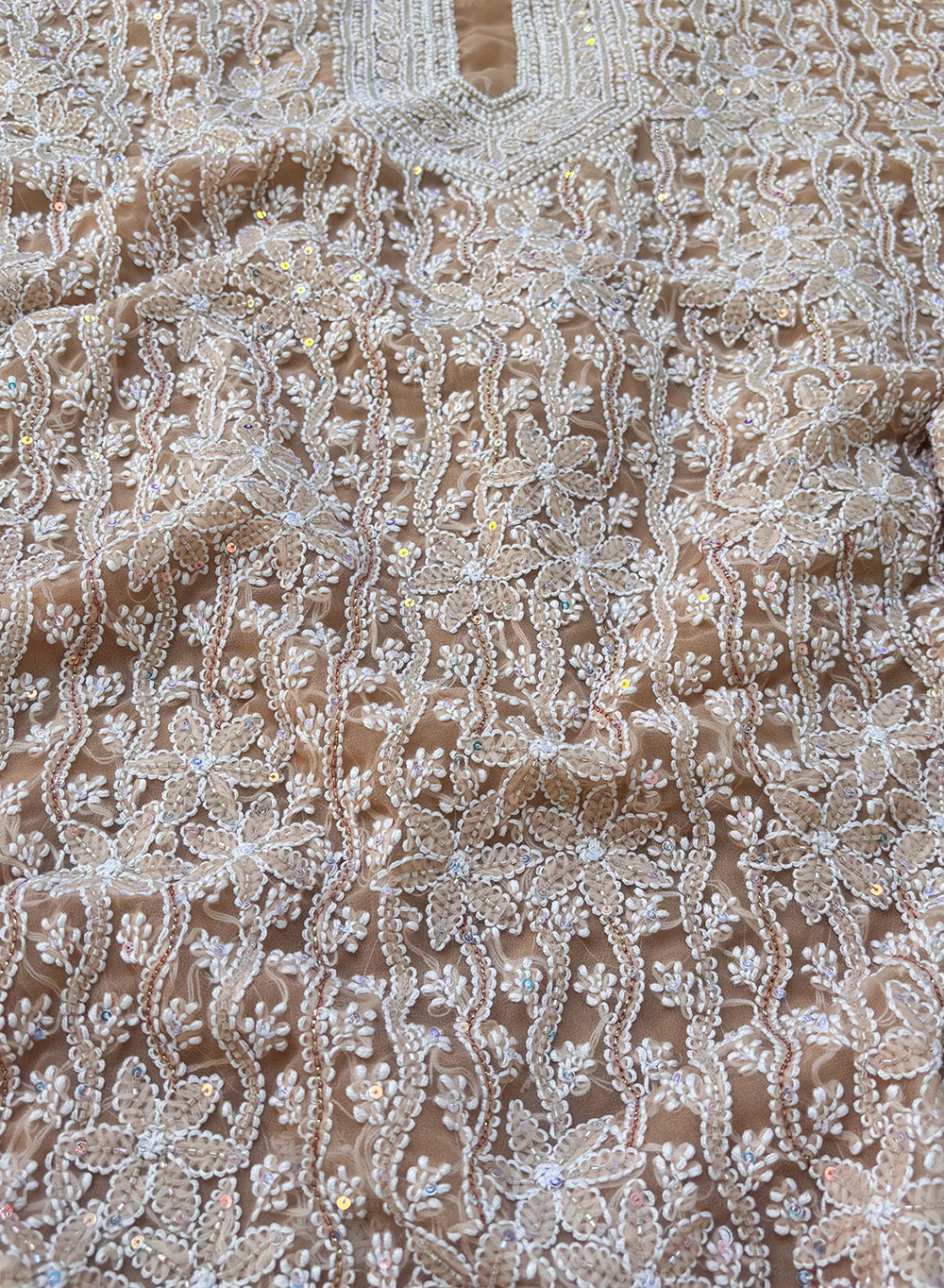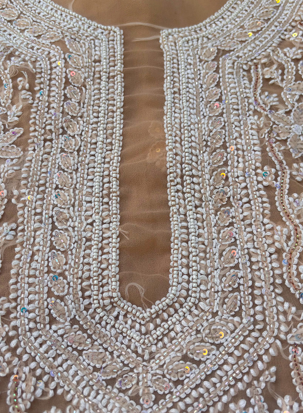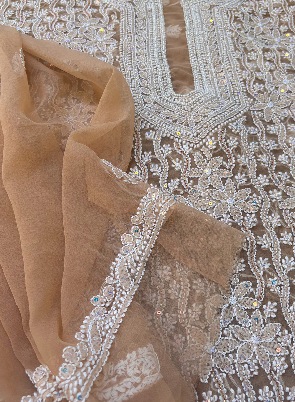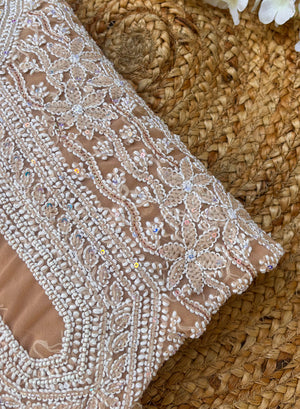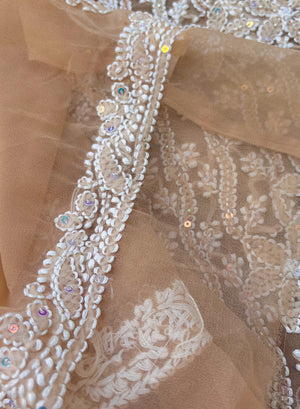 This stunning one of a kind beige georgette full dress set, has been hand embroidered with moti sequin and white resham dhaaga.
