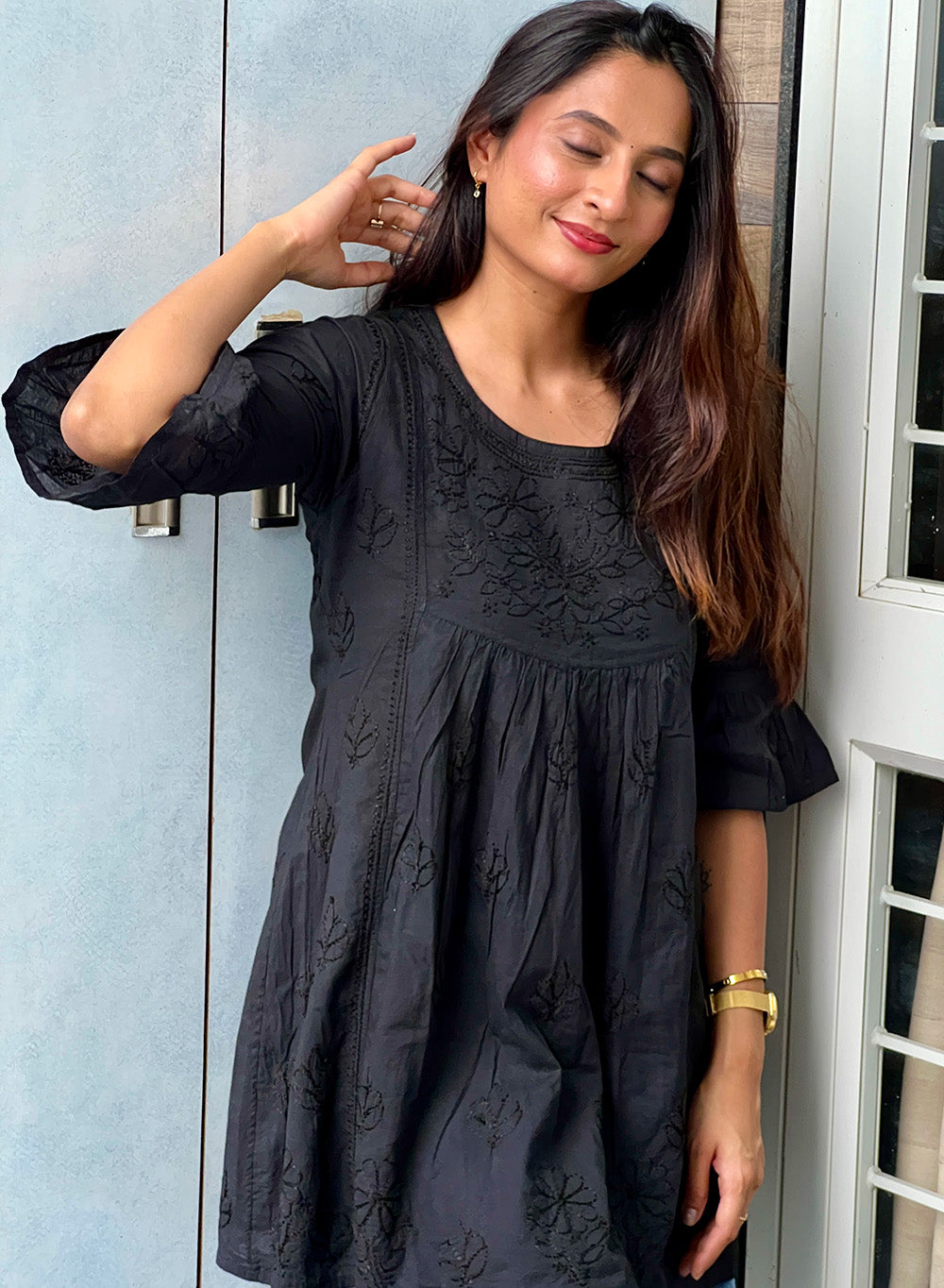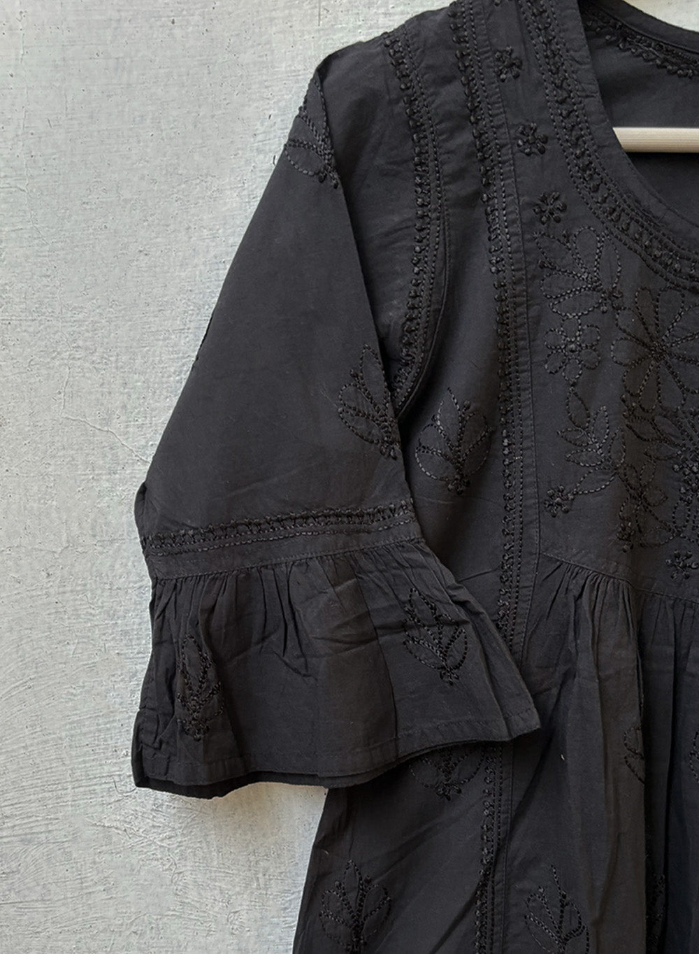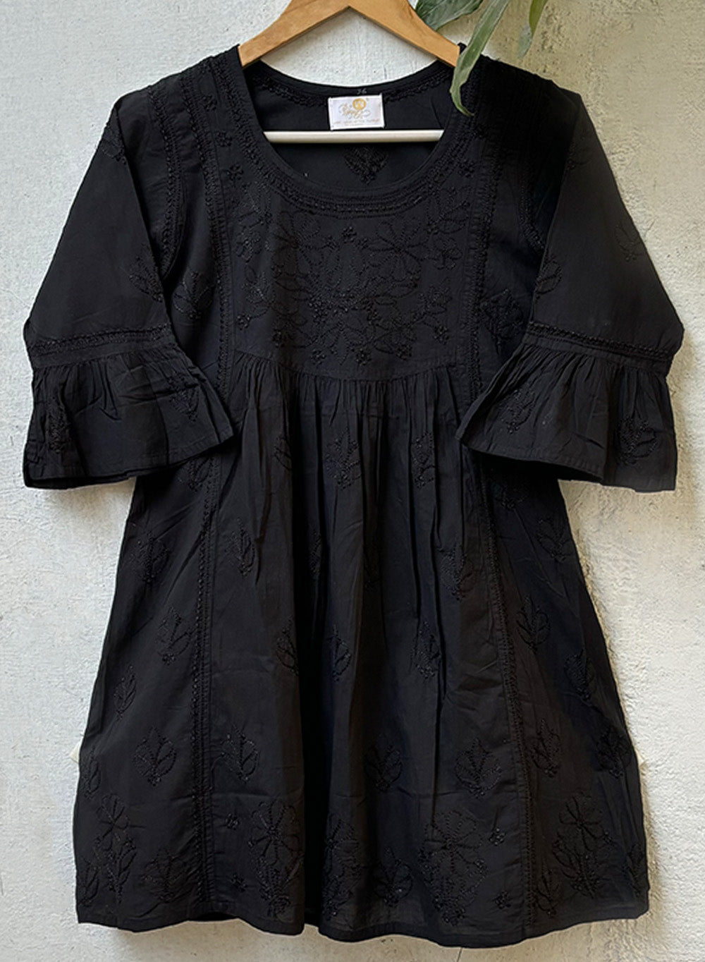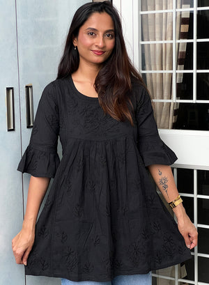 Black Bell Sleeves - Pure Cotton Gulshan Chikankari Short Top