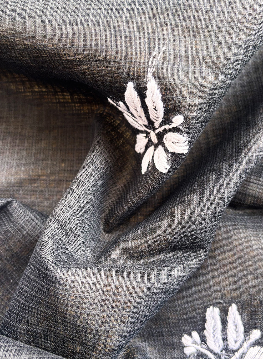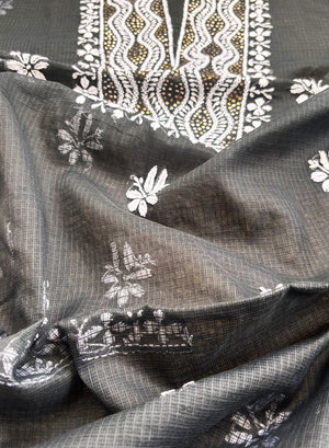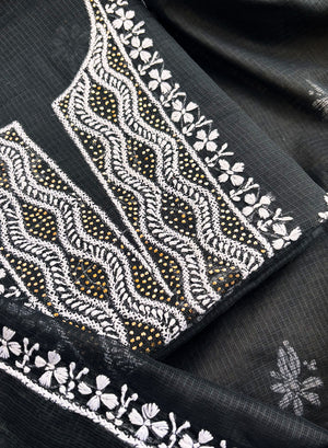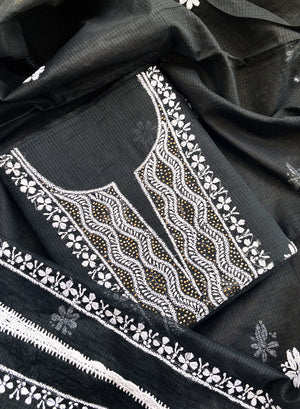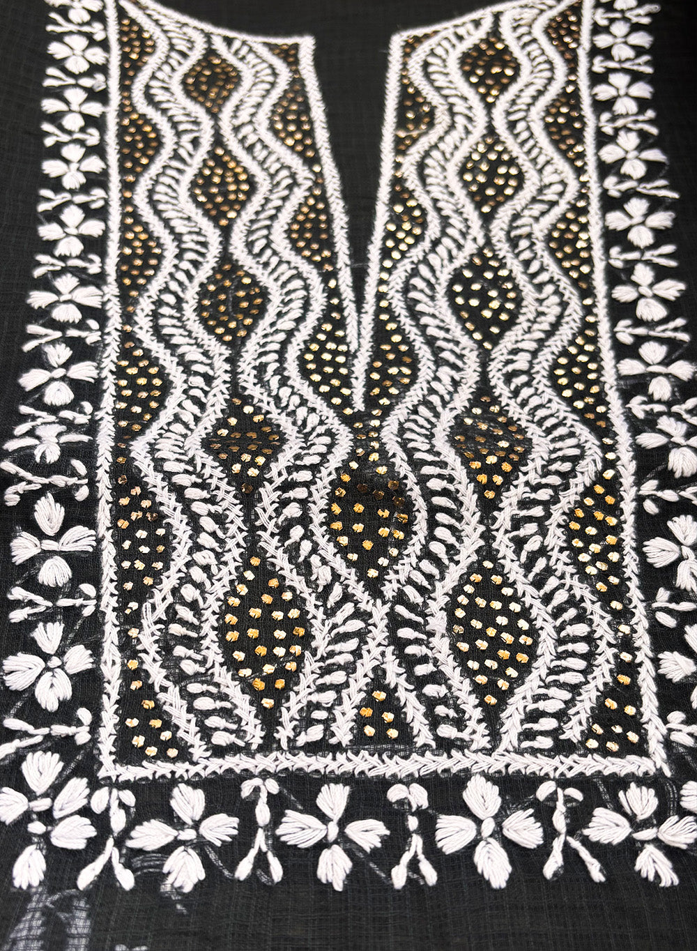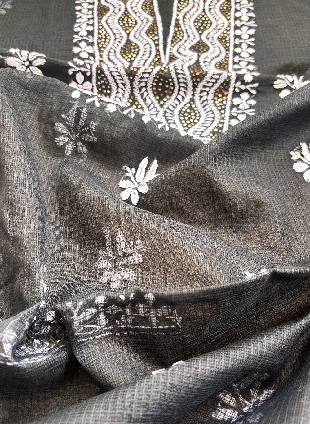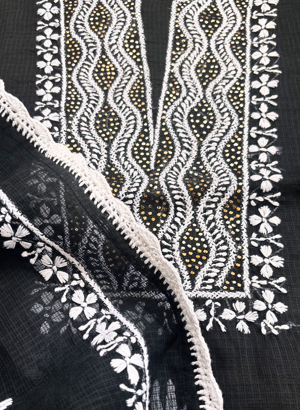 Our Black with Mukaish Kota Cotton Kurta Material with Dupatta Set, has been hand embroidered with twisted cotton thread and mukaish work on it.