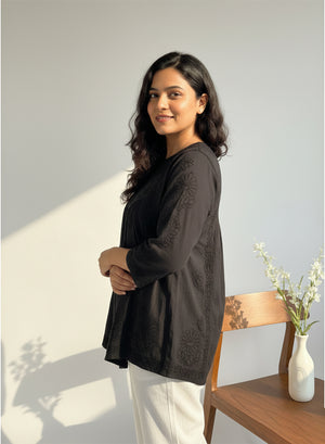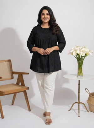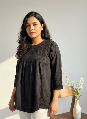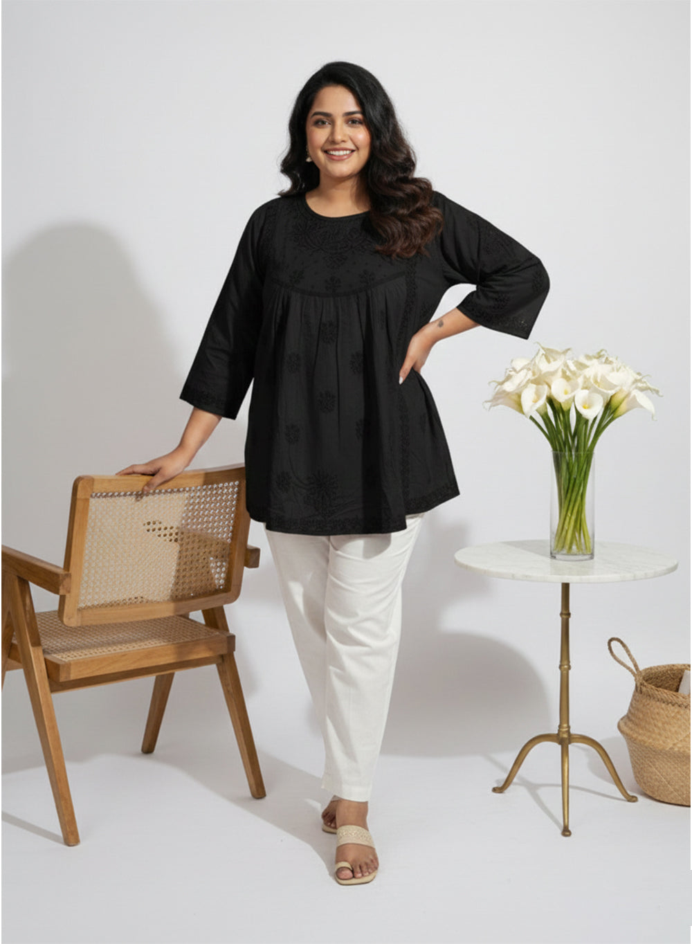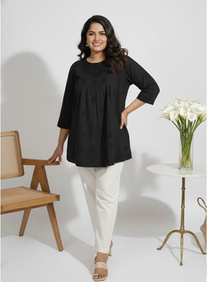 Our one of a kind Pure Cotton Short Top, has been hand embroidered with resham dhaaga and has beautiful chikankari motifs.