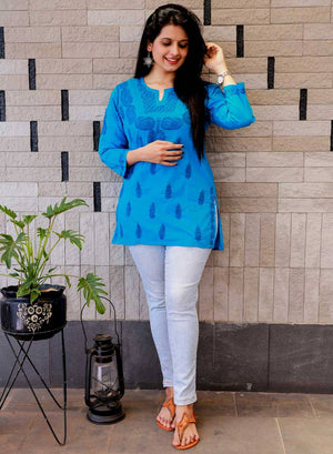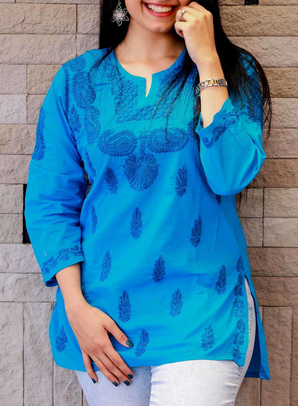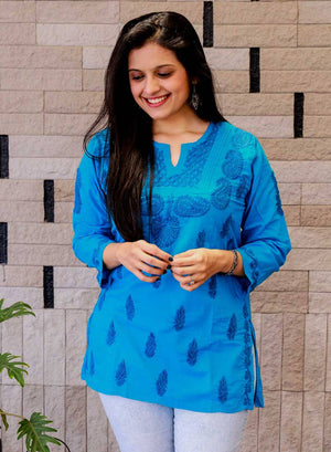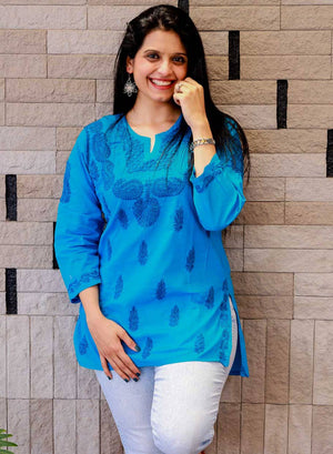 Blue Checks - Gulshan Cotton Chikankari Short Top