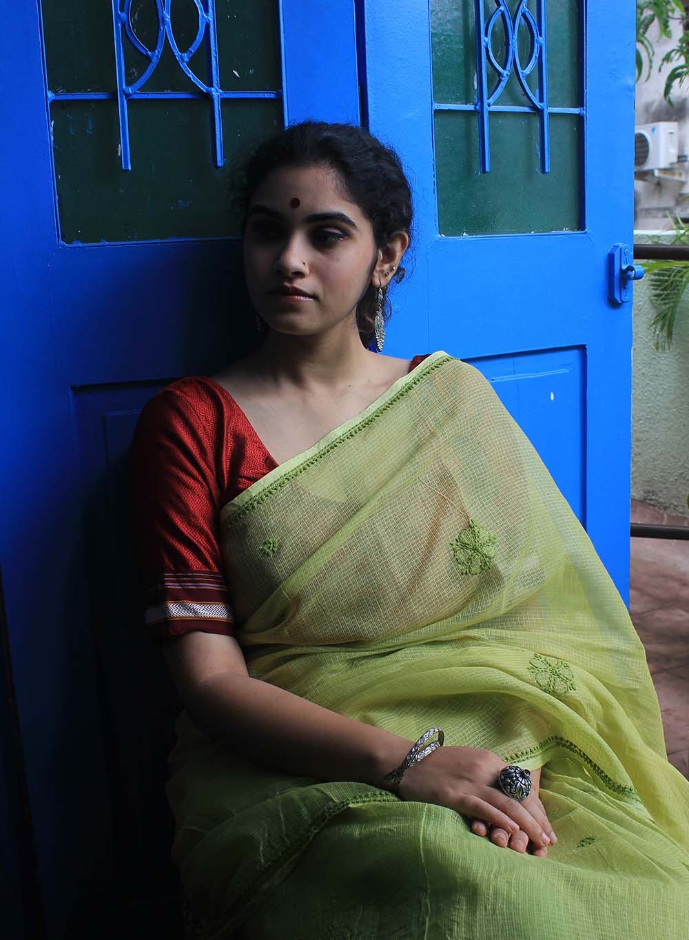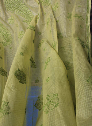 Our Palvi Kota Cotton Saree, has beautiful, big, hand embroidered paisley motifs on the pallu and small flowers scattered in the entire length of the saree.