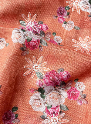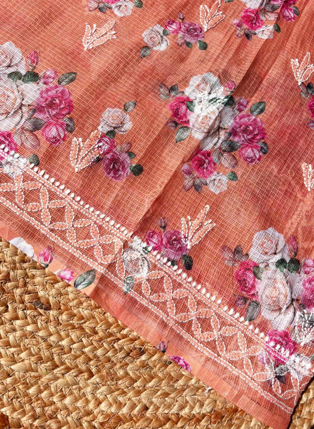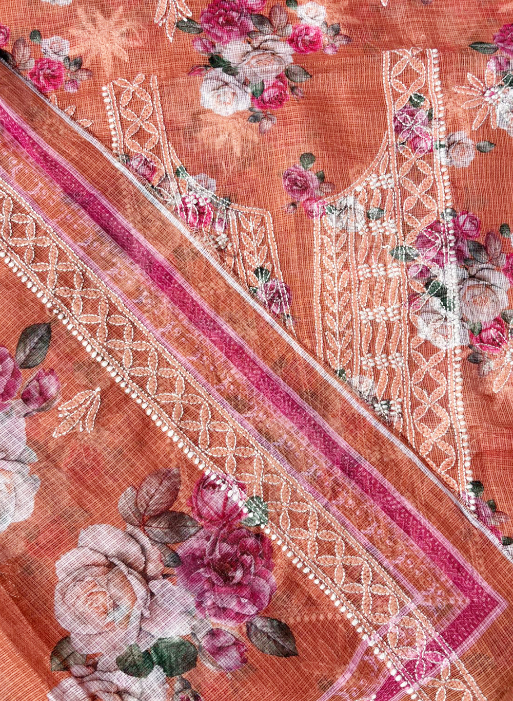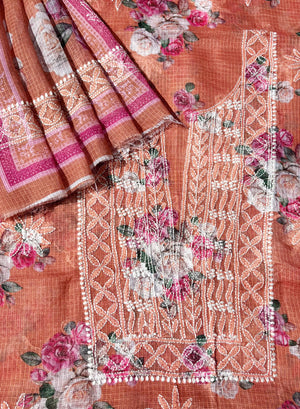 Our Brick Printed Kota Cotton Kurta Fabric & Dupatta Set, has been hand embroidered with twisted cotton thread .