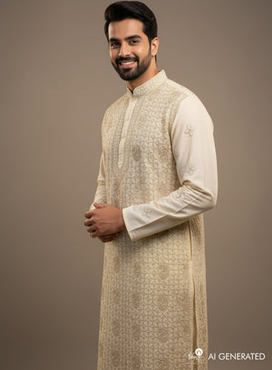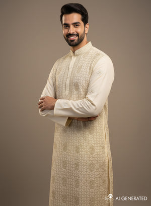 Cream - Nawab Cotton Chikankari Men Long Kurta