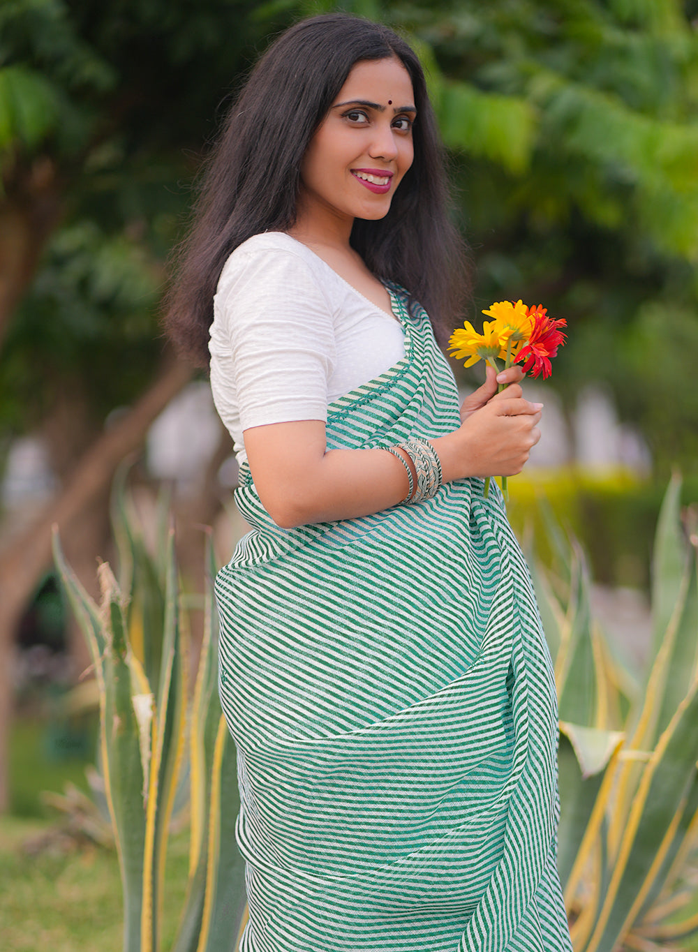 Dark Green Lehariya - Kota Aks Cotton Chikankari Saree