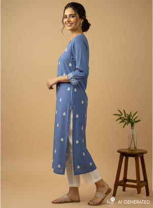 Our beautiful Denim - Bahaar Cotton Chikankari Kurta, has been hand embroidered with twisted White cotton thread.
