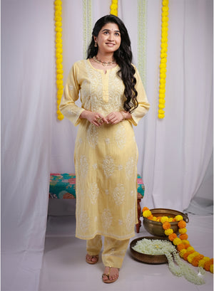 Eraya Pale Yellow - Mul Chanderi Nargis Chikankari Set