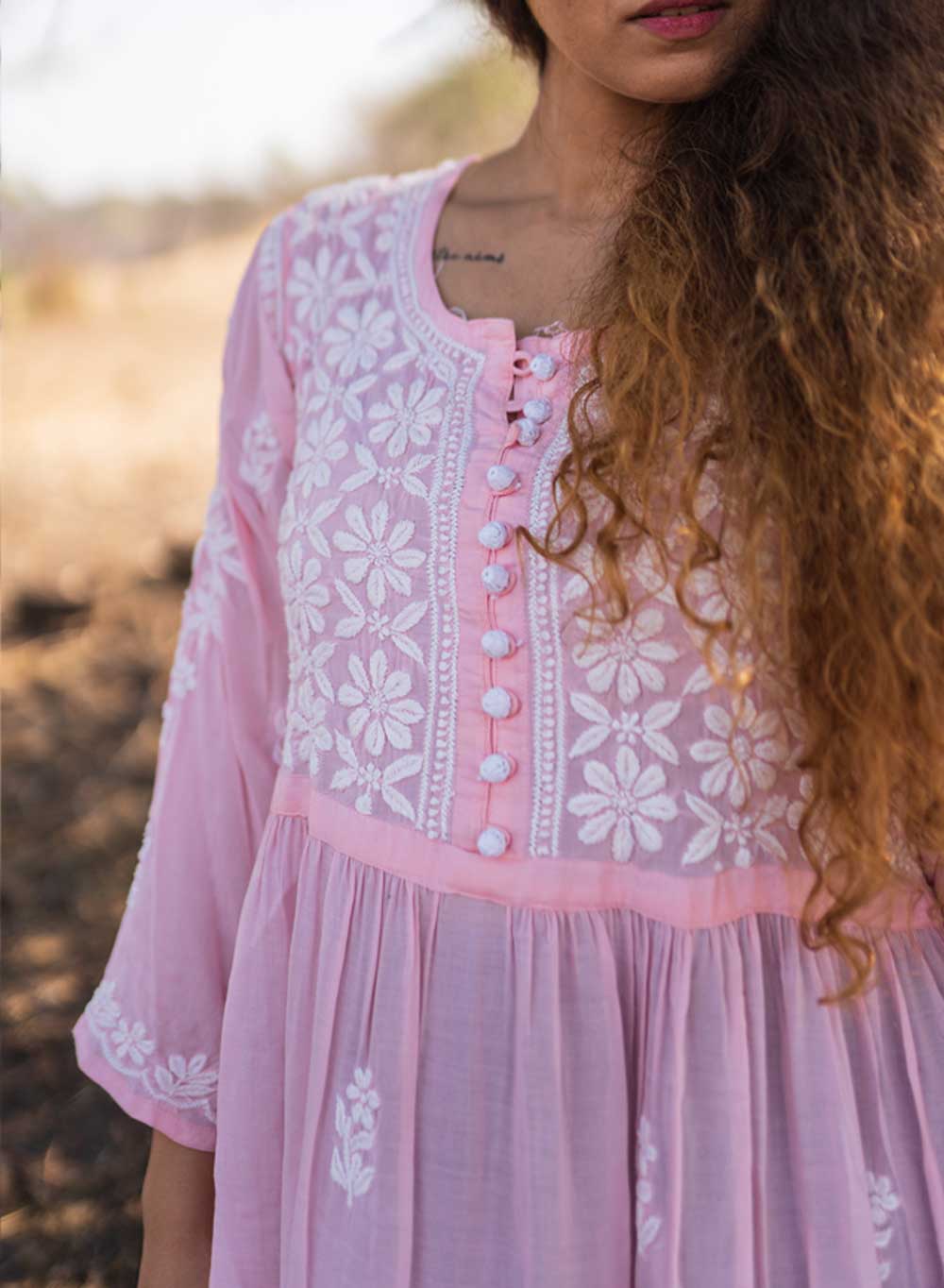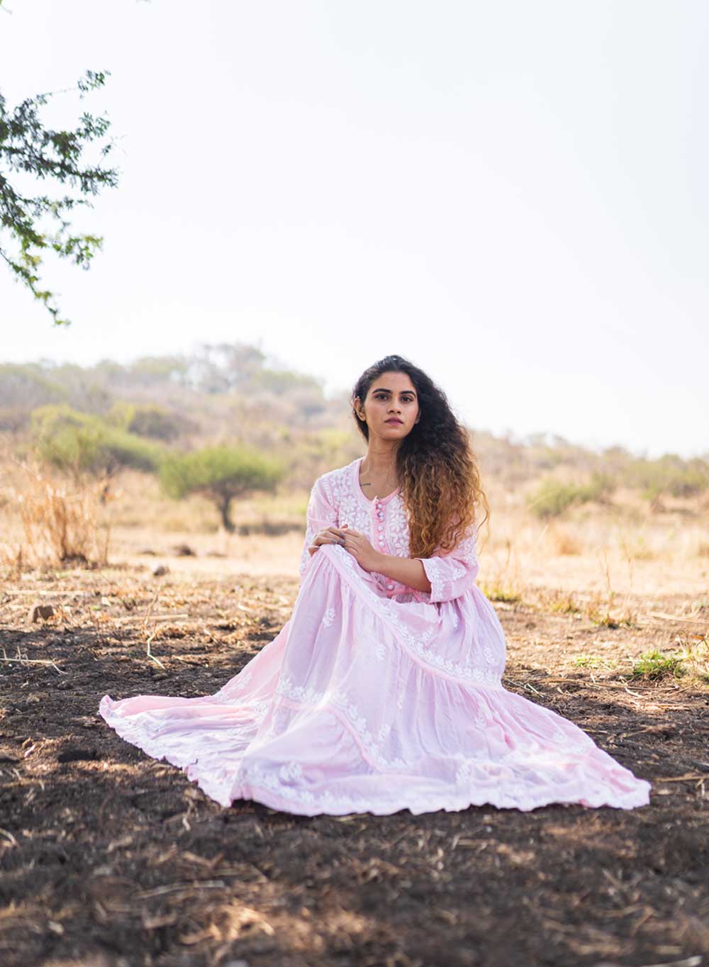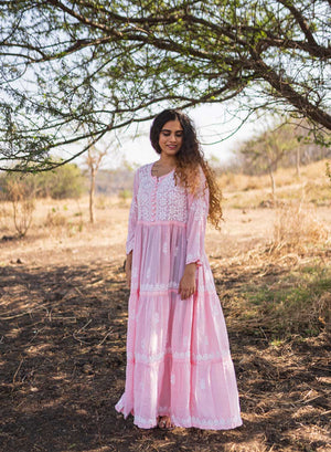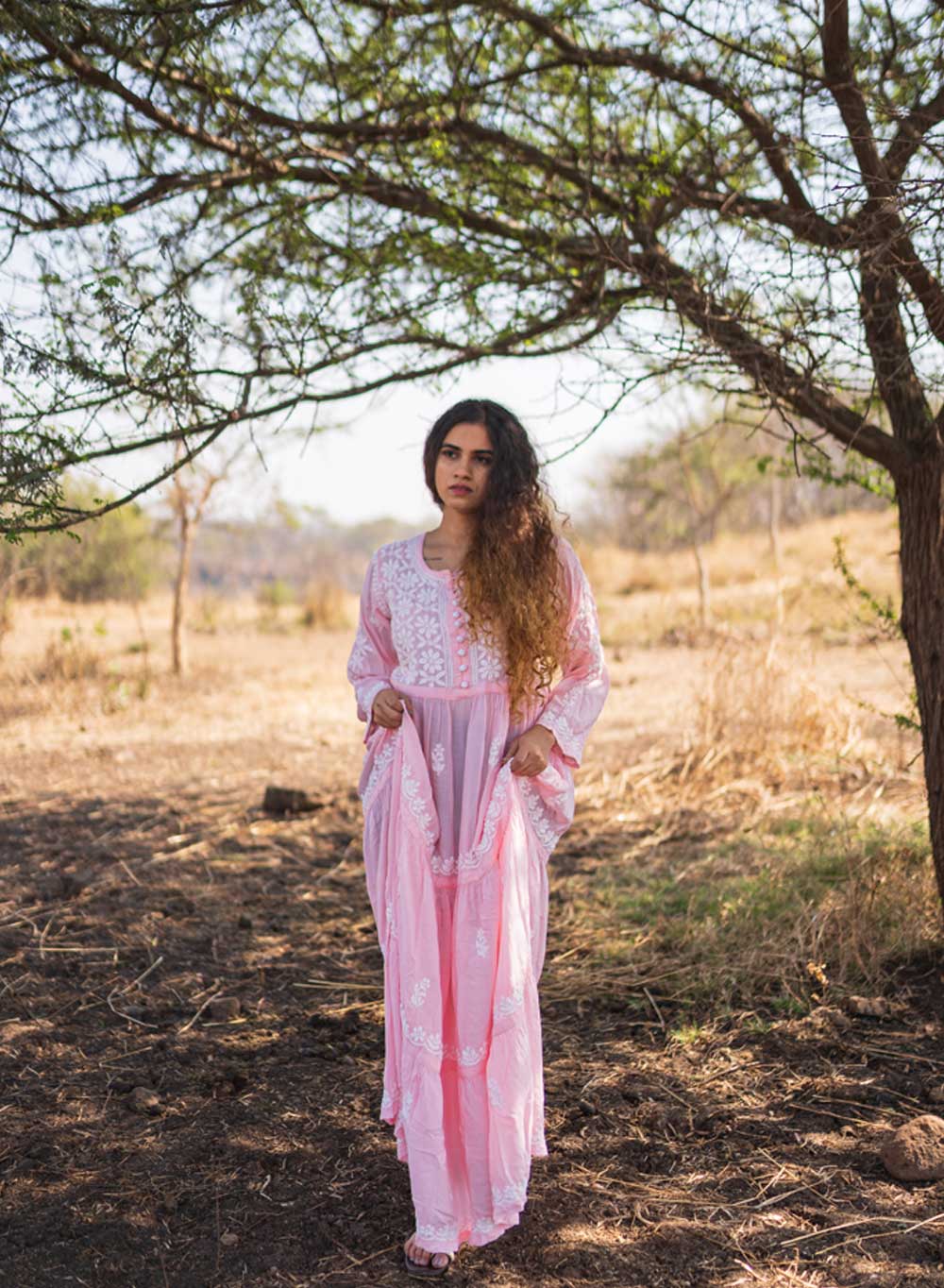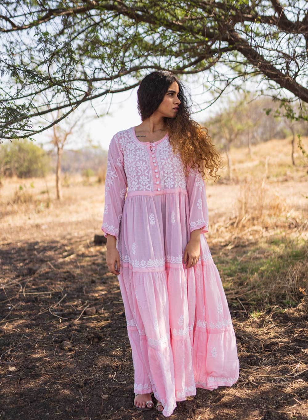 One of the more decorative designs with it's lush embroidered front panel, borders and back, Falak comes with a splash of color on these modal one piece dresses.