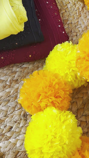The breezy viscose base is intricately embroidered and the chikankari ensemble has been embellished with golden fardi / mukaish to give it that grand look.