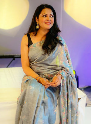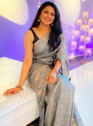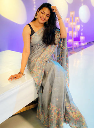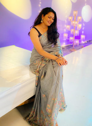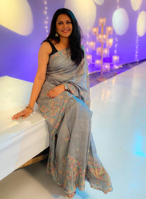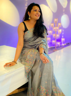 Inspired by the delicate feel of Lucknowi Chikankari our Gray Pure Tussar Silk Saree has been painstakingly hand embroidered with multicolored resham dhaaga.