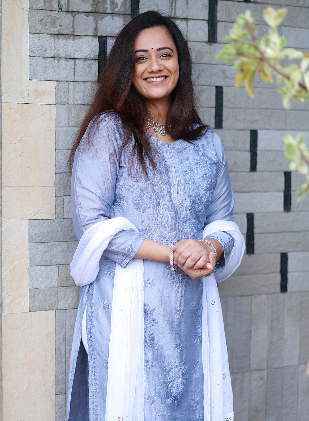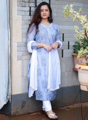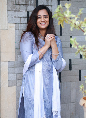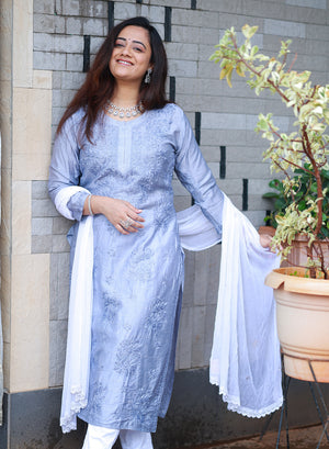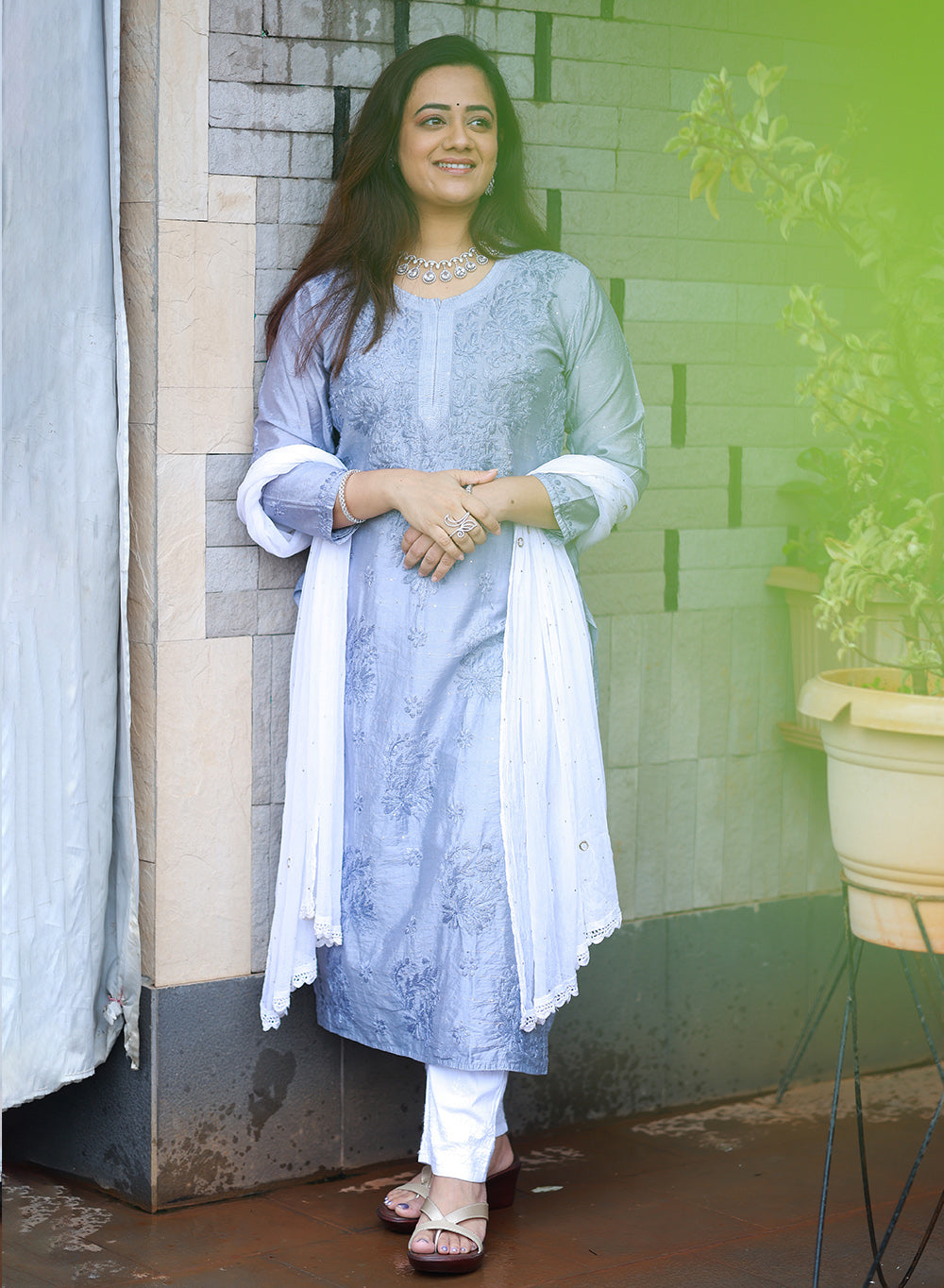 Ice Blue Firdaus - Cotton Chanderi Chikankari Kurta with Sequin