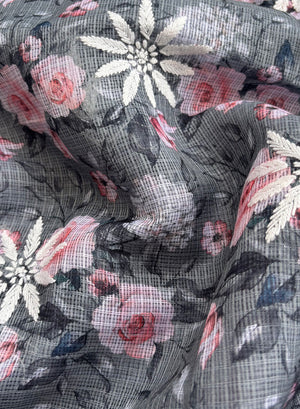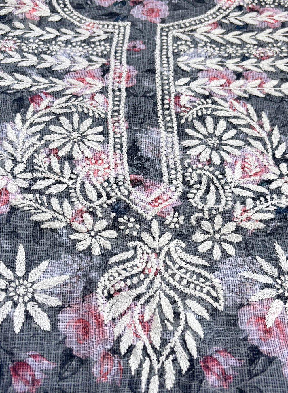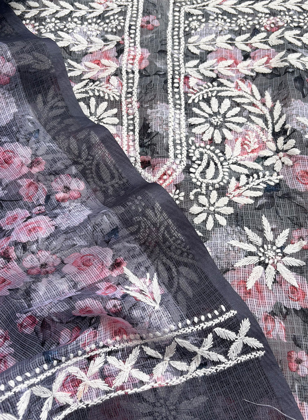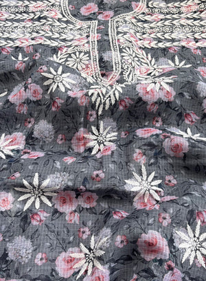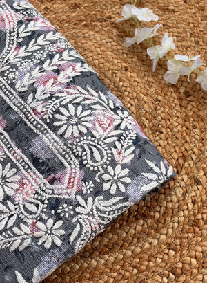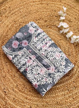 Our Gray Printed Kota Cotton Kurta Fabric & Dupatta Set, has been hand embroidered with twisted cotton thread .