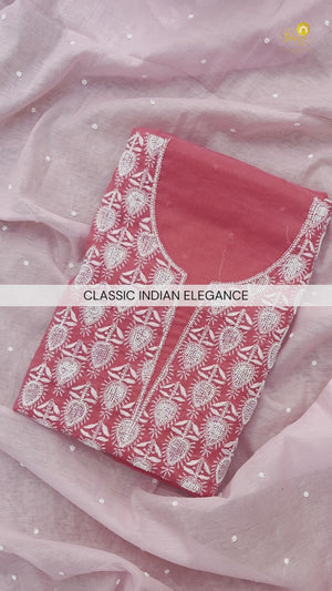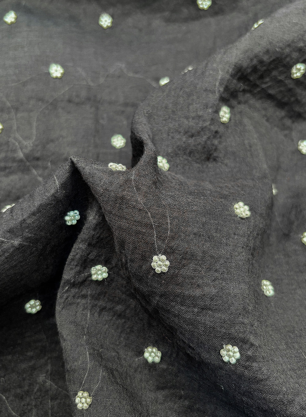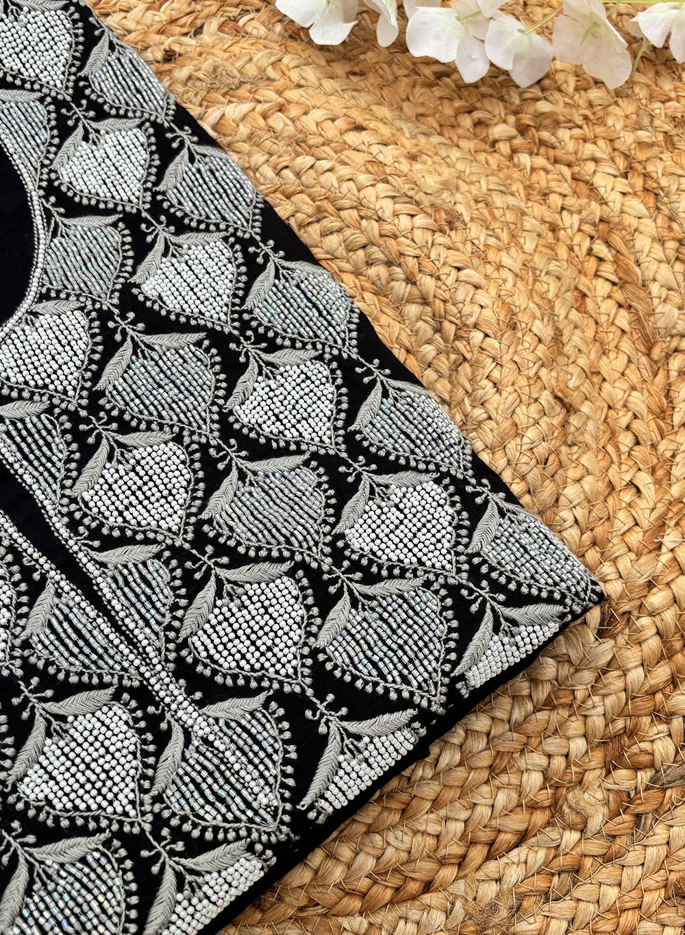 It has been painstakingly hand embroidered by our karigars with twisted cotton thread in teen taar embroidery and embellished with white pearls and katdana work on rose motif embroidery.