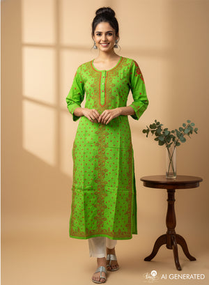 Our beautiful Green - Bahaar Cotton Chikankari Kurta, has been hand embroidered with twisted White cotton thread.