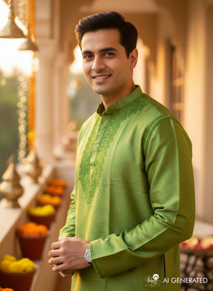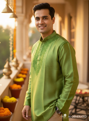 Green - Nawab Cotton Silk Chikankari Men Long Kurta