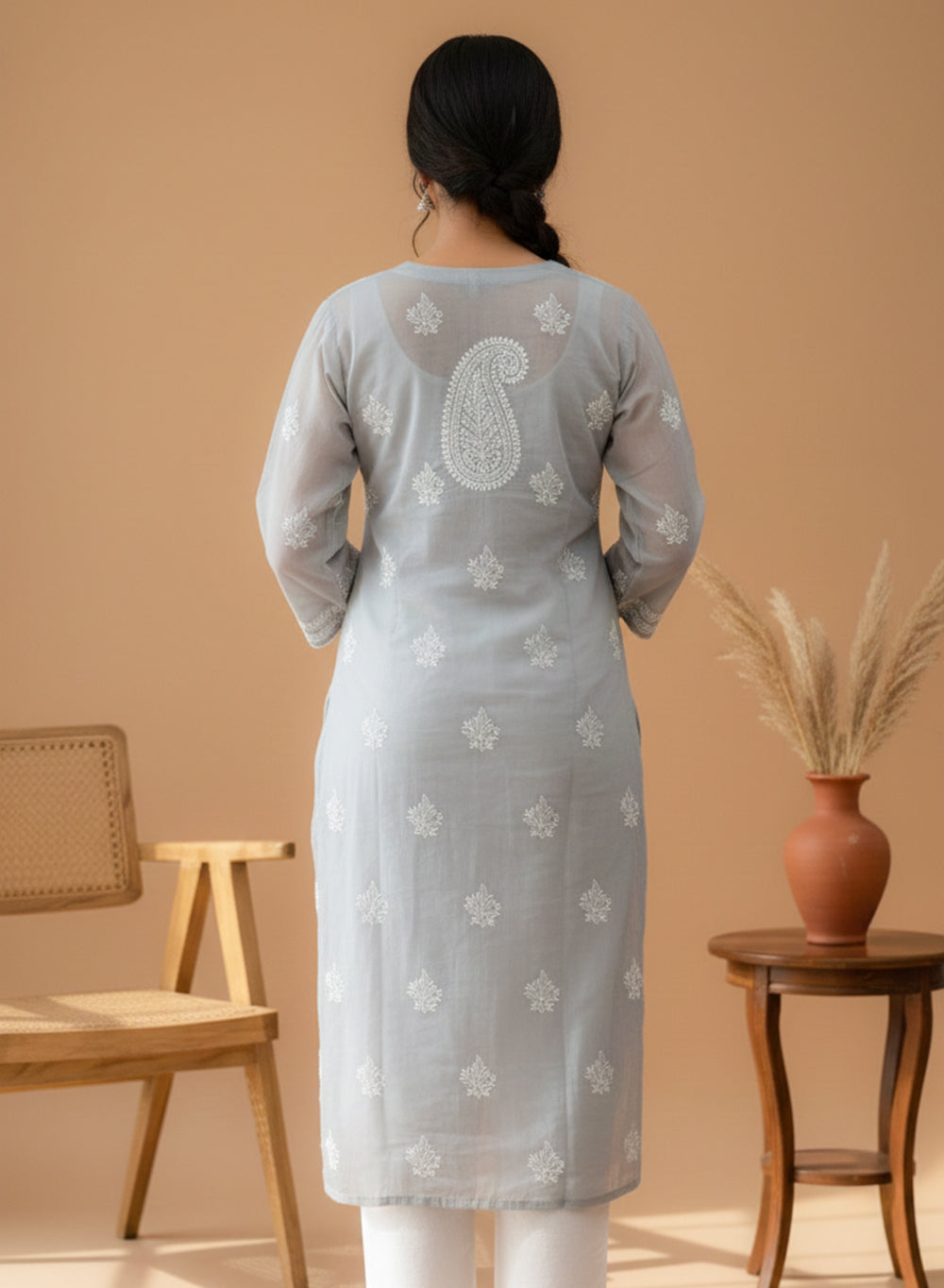 Grey With Crochet Lace - Cotton Terry Voile Bahaar Chikankari Kurta With Slip