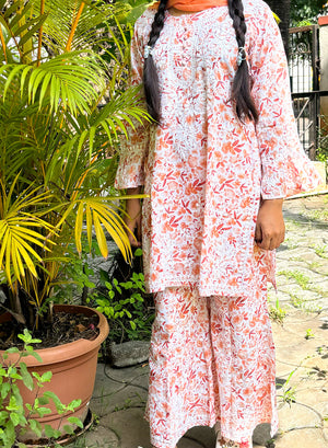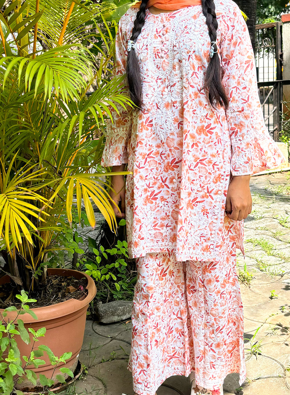 Introducing our Gulnaar Orange Printed - Cotton Chikankari Kidswear Set, from the Nanhe Farishte Collection.