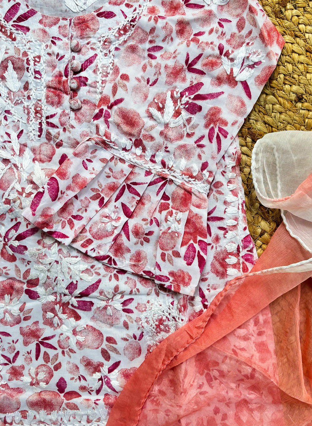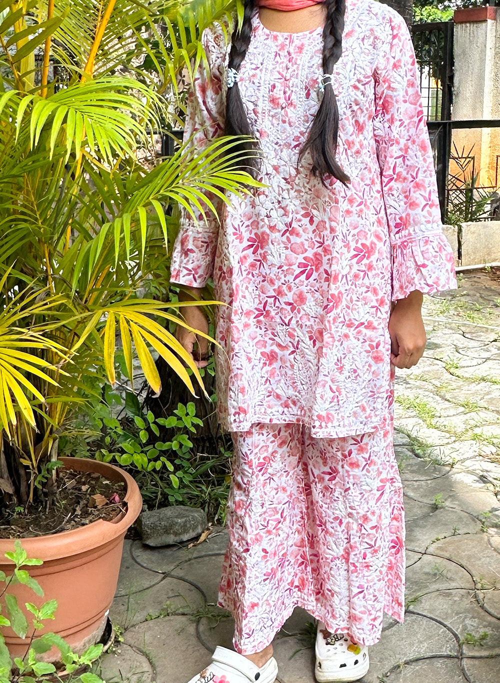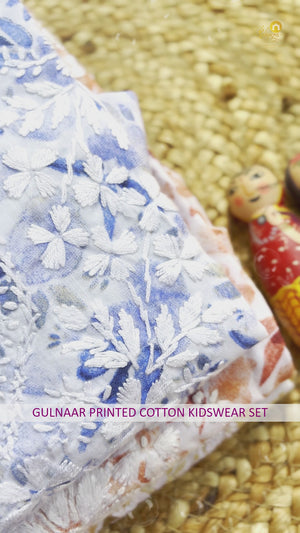 The word "Gulnaar" means "like a flower" or "blossoming," and this beautifully crafted kidswear set lives up to that name, featuring intricate hand-embroidered chikankari motifs that celebrate the traditional art of Lucknowi chikankari.