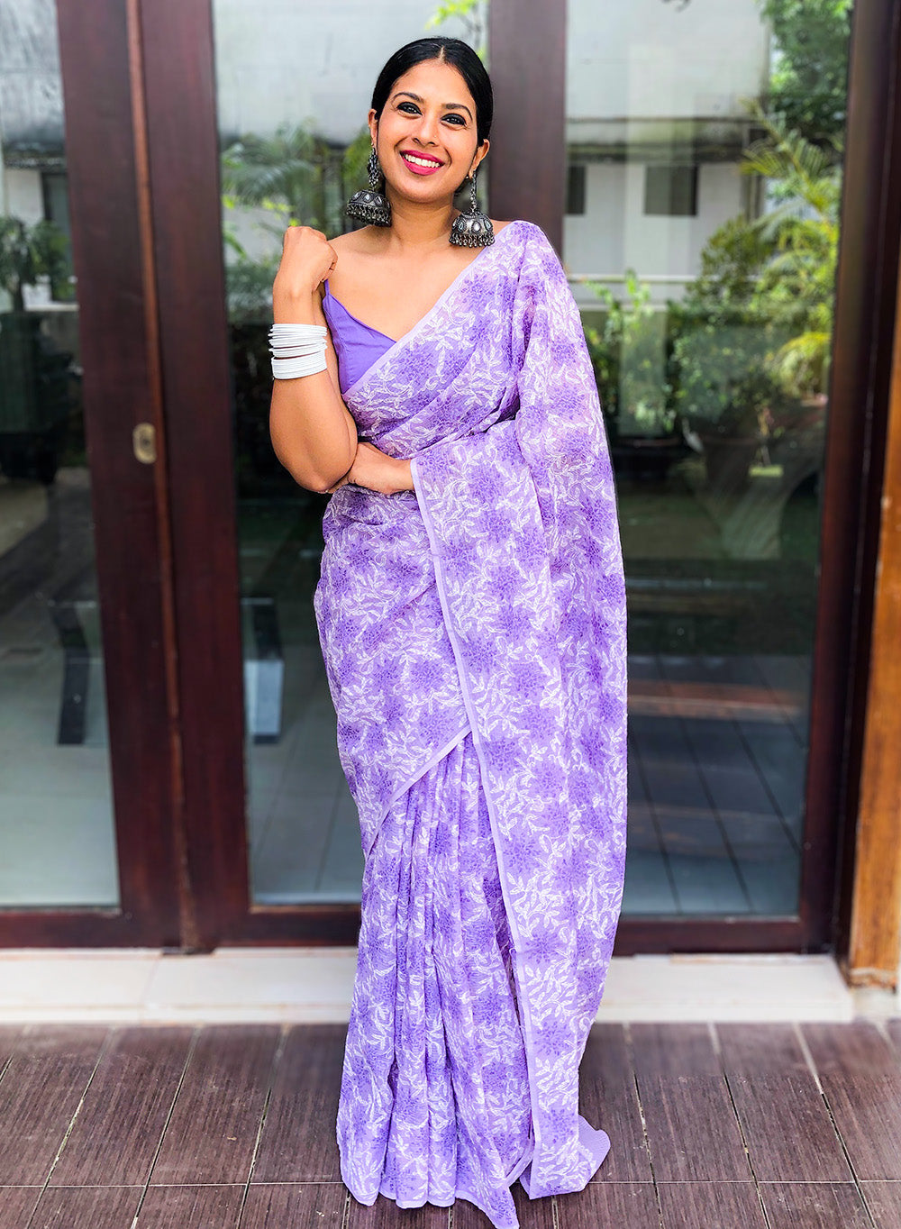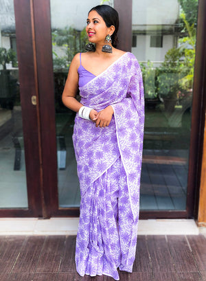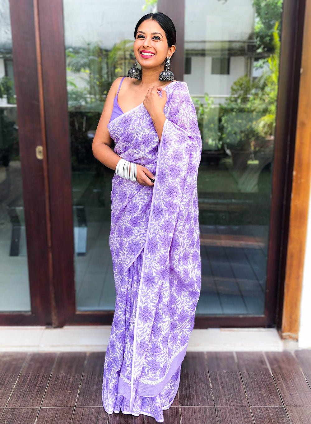 This gorgeous lavander saree from the Guncha Collection, has been hand embroidered on a kota base, with white and dark blue twisted cotton thread.