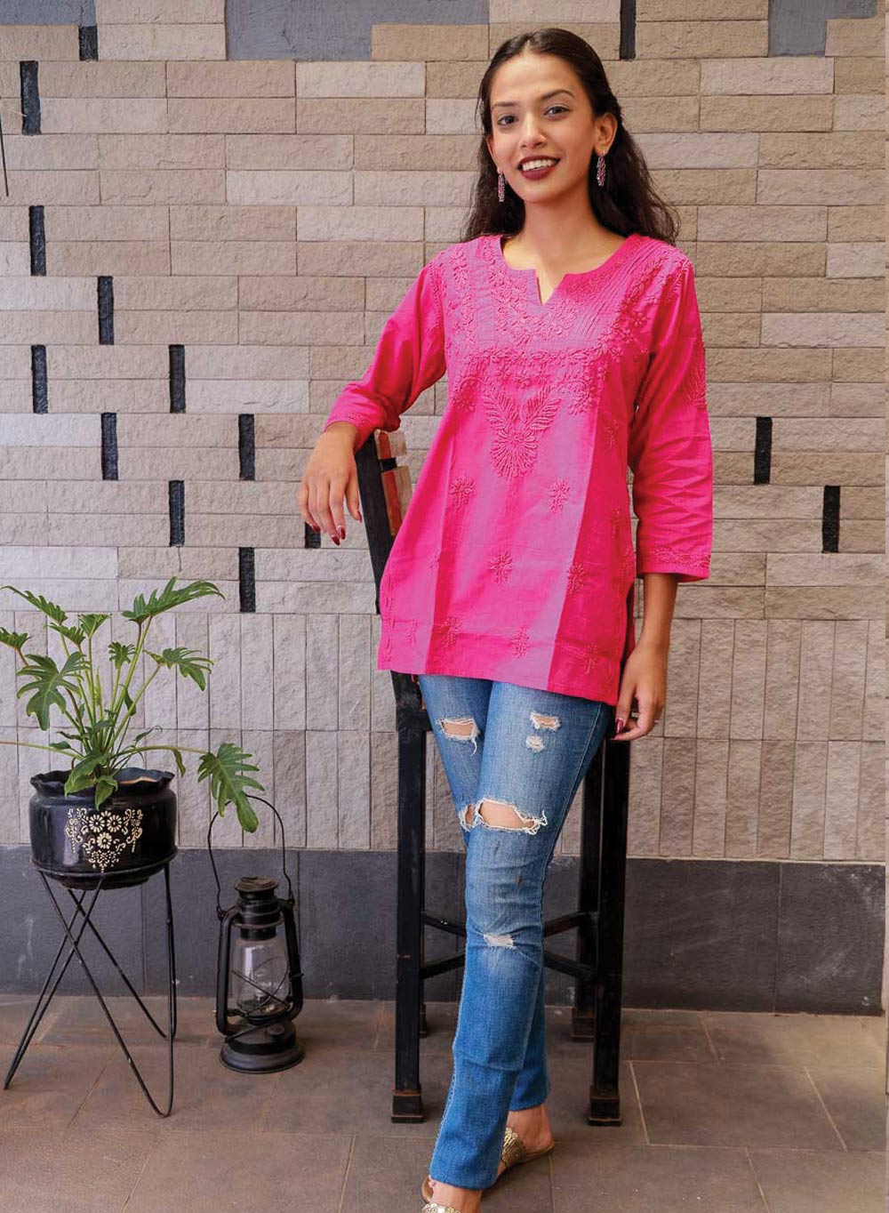Hot Pink Checks - Gulshan Cotton Chikankari Short Top