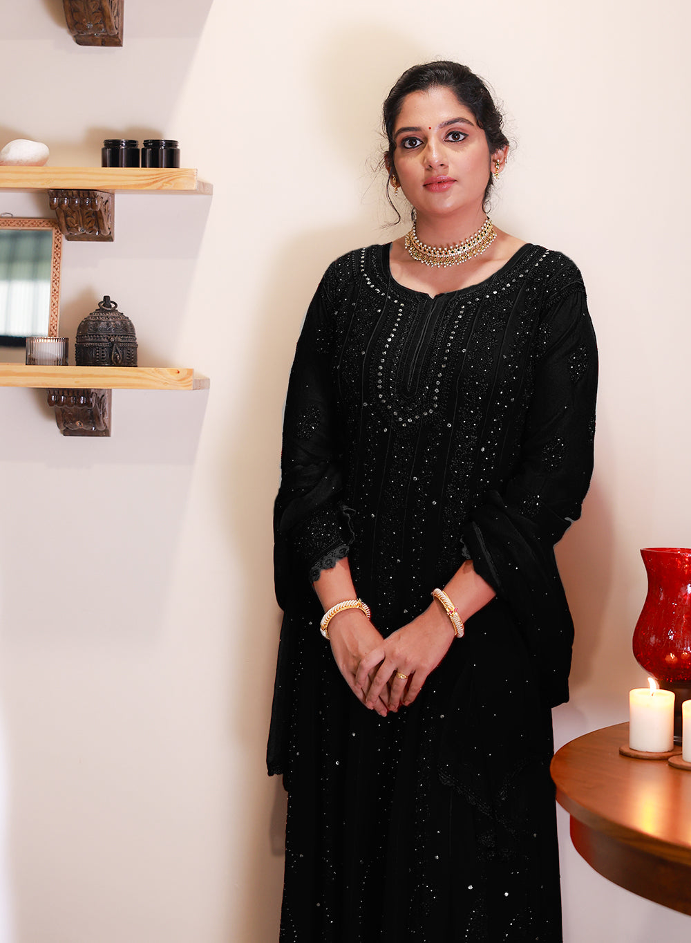 Reflecting this essence, Ibadat is a graceful Viscose Anarkali & Dupatta Set adorned with intricate mukaish work that glimmers like starlight.
