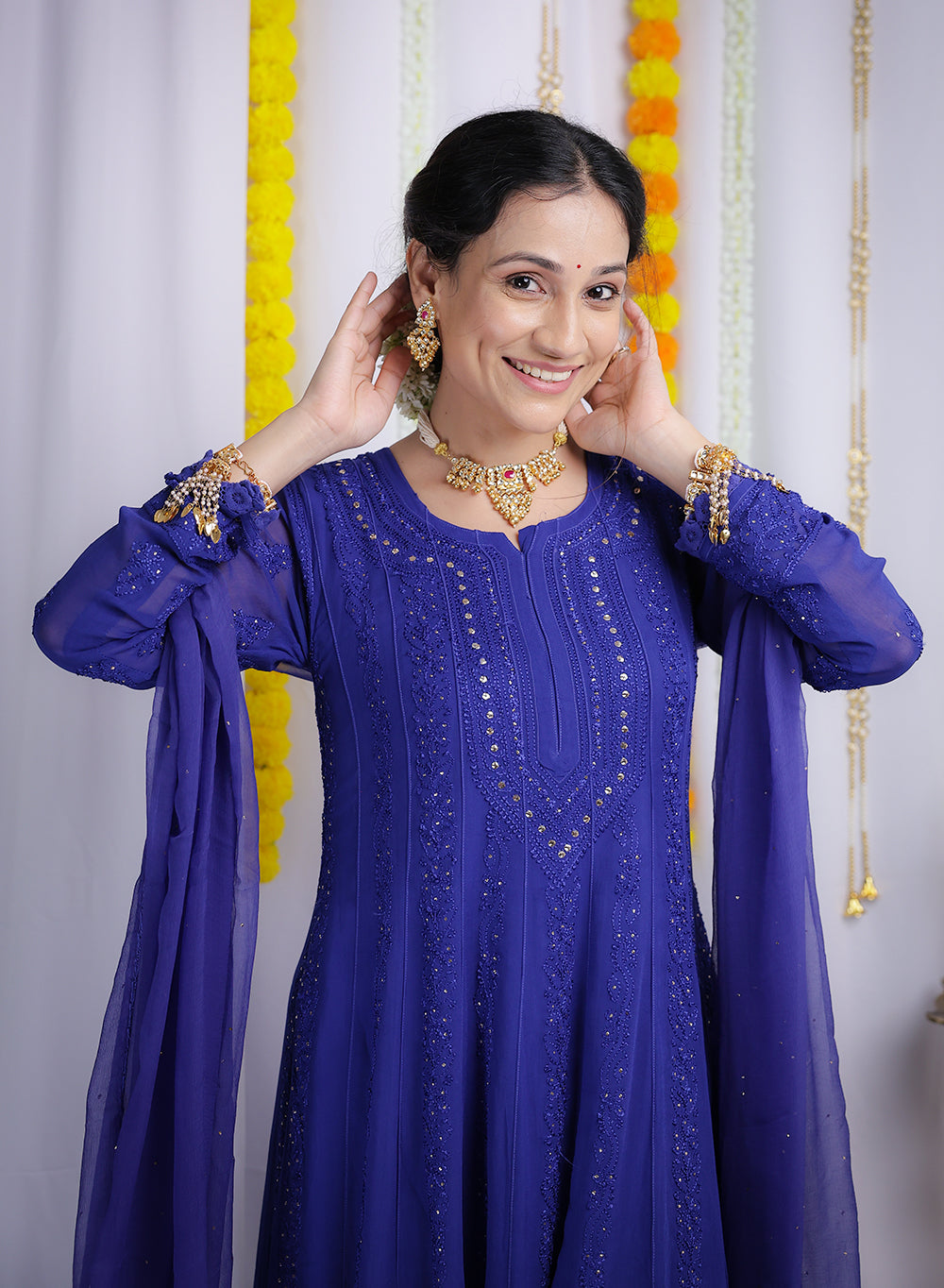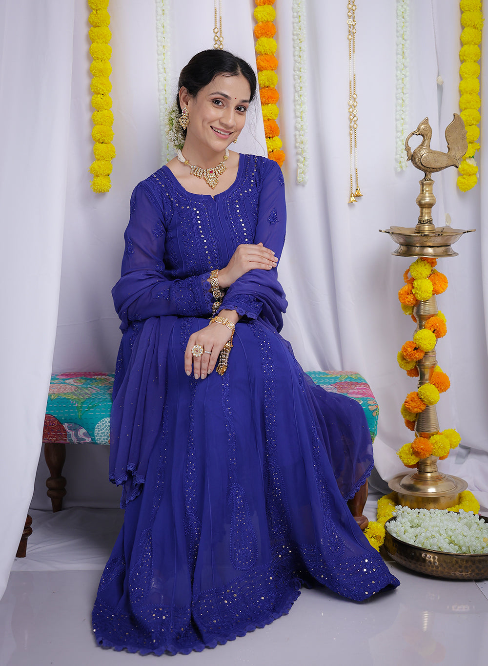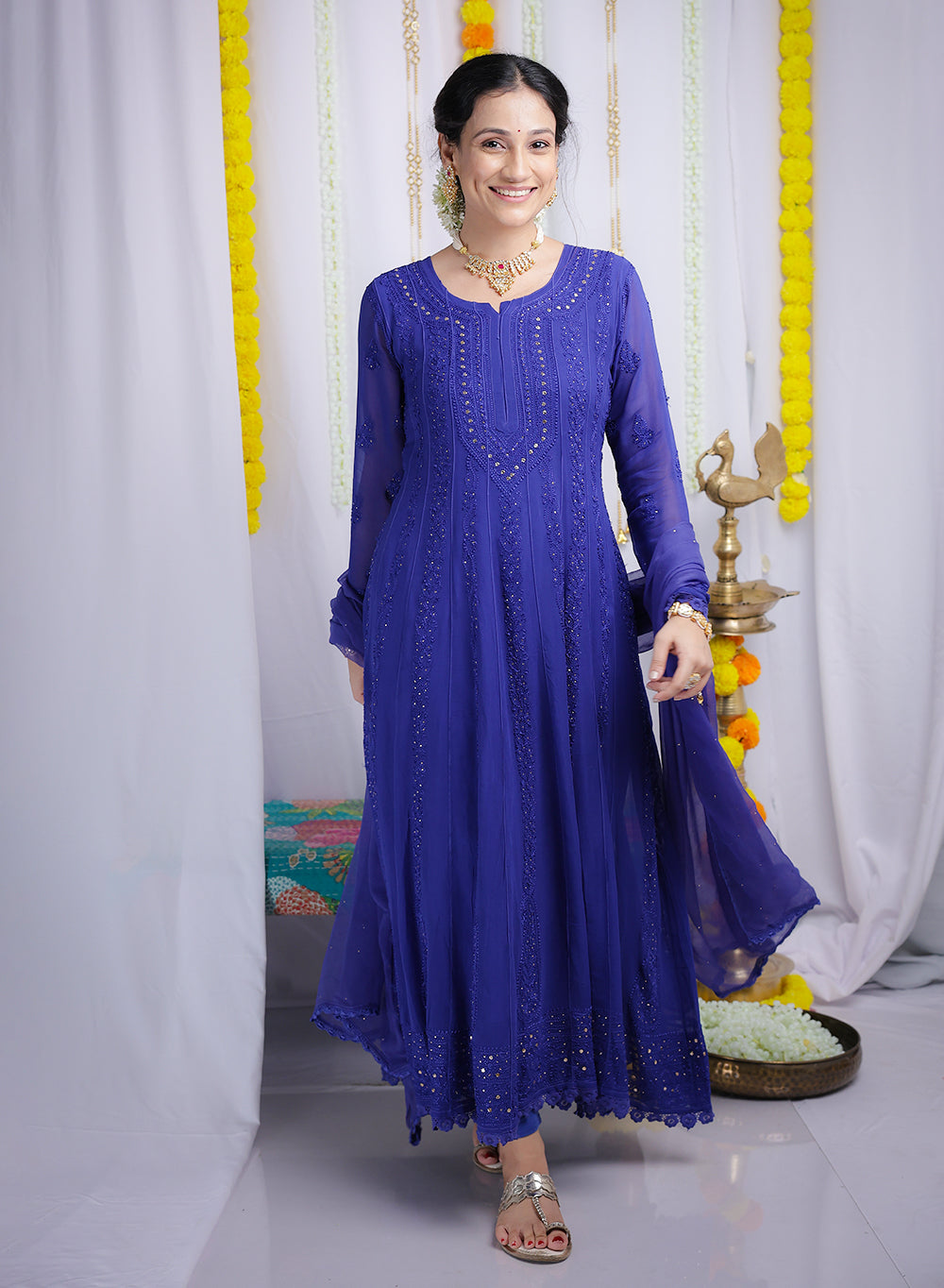 Ibadat Royal Blue - Viscose Anarkali & Dupatta Nargis Chikankari Set