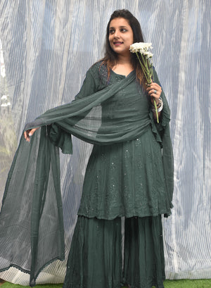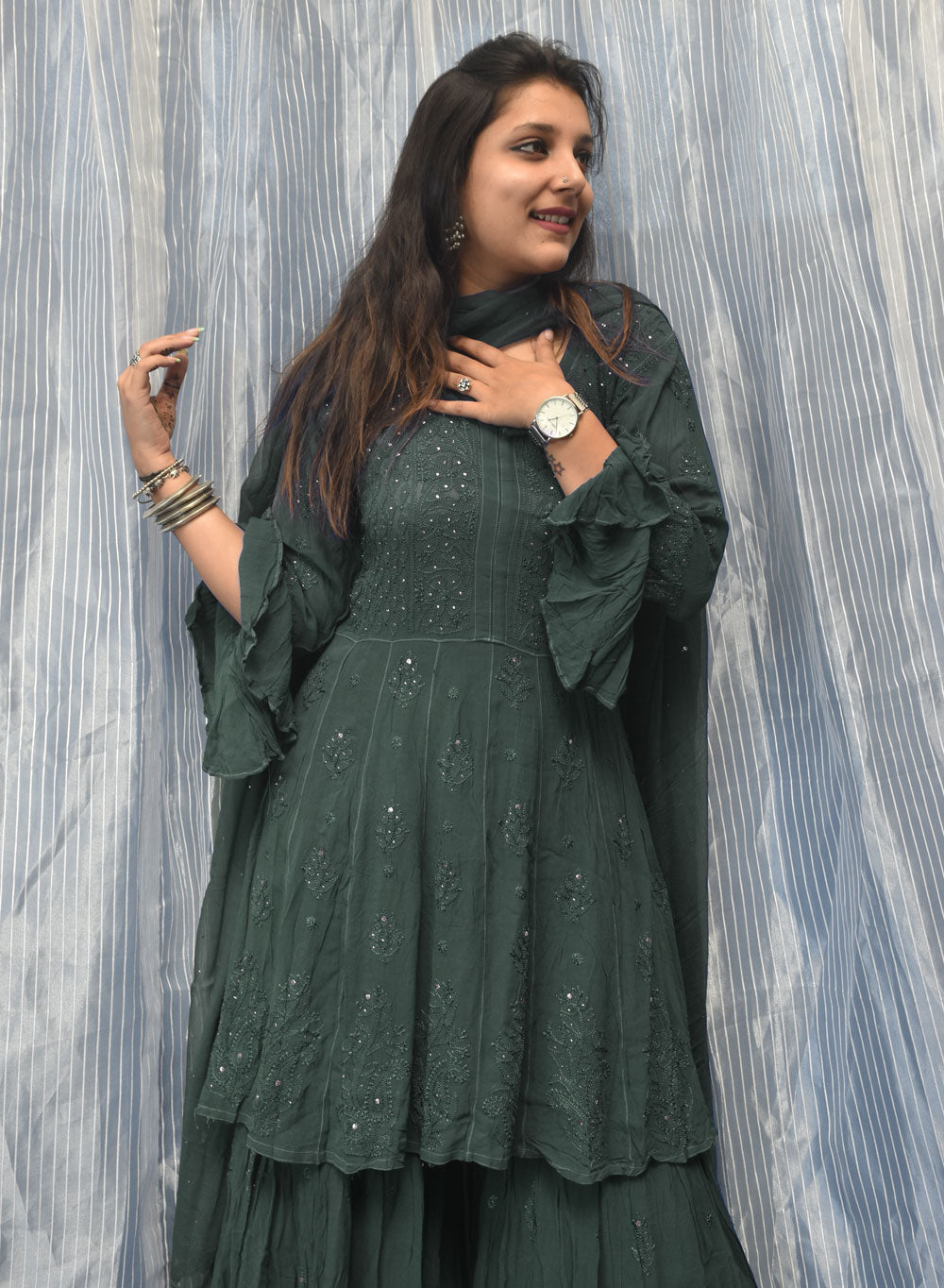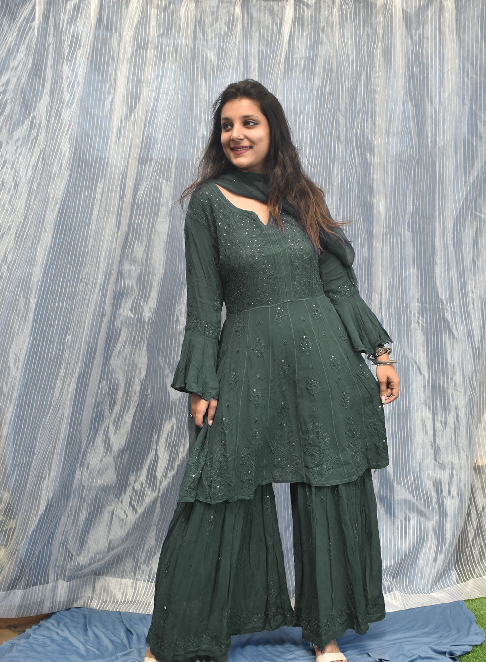 Inara Bottle Green - Nargis Viscose Short Anarkali Chikankari Gharara Set