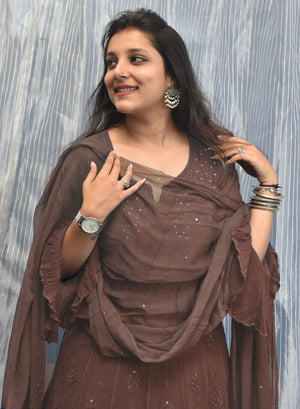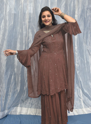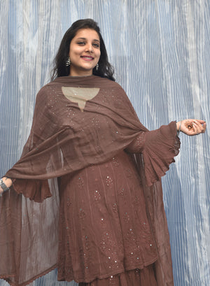 Our Viscose Short Anarkali Gharara Set, comes with a knee length anarkali with bell sleeves, a viscose gharara and a pure chiffon dupatta.