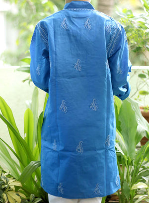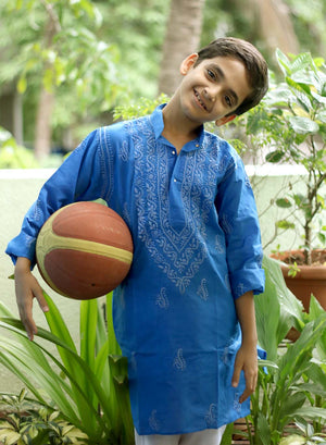 Our Navy Blue Cotton Kurta with hand embroidered chikankari in a traditional neck booti ,for Chhote Nawabs, are woven from finely milled cotton terry voile, cool and crisp against their soft skin.