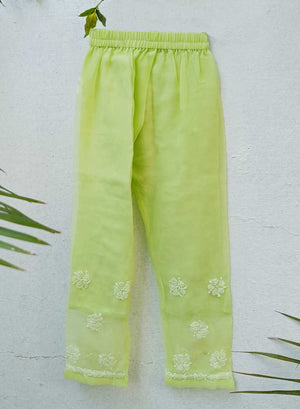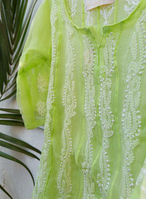 Our Ira Light Green Georgette Set from our Nanhe Farishtay Collection, has hand embroidered Chikankari motifs in cotton thread.