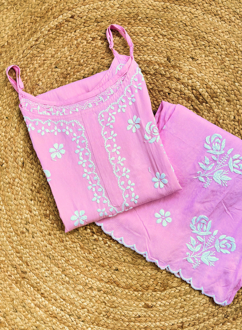 Made from soft, breathable rayon, this set is designed for comfort that feels naturally refined. The adjustable noodle straps ensure a perfect fit, while delicate scalloped edges on both the kurta and bottoms add a graceful, handcrafted touch.