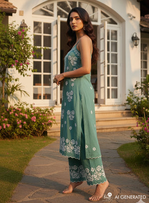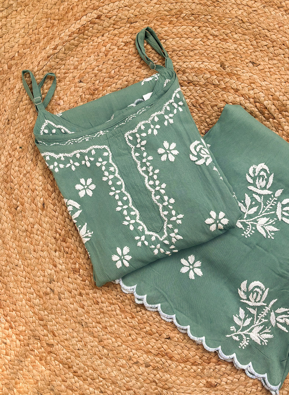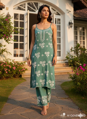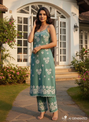 Kala Turquoise - Nargis Chikankari Rayon Noodle Strap Kurta & Palazzo Set