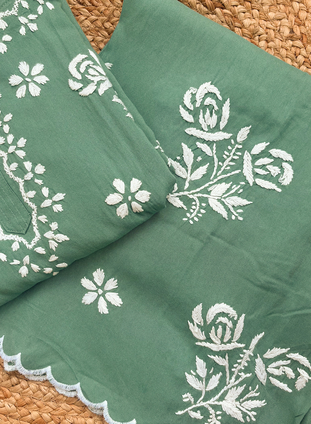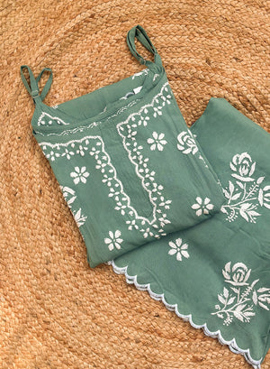 Made from soft, breathable rayon, this set is designed for comfort that feels naturally refined. The adjustable noodle straps ensure a perfect fit, while delicate scalloped edges on both the kurta and bottoms add a graceful, handcrafted touch.