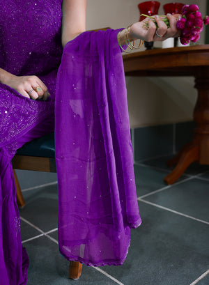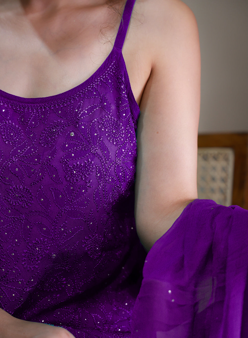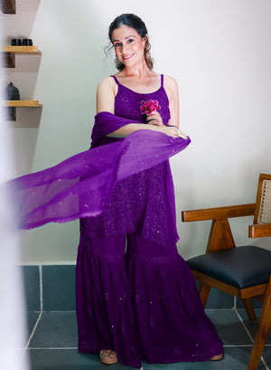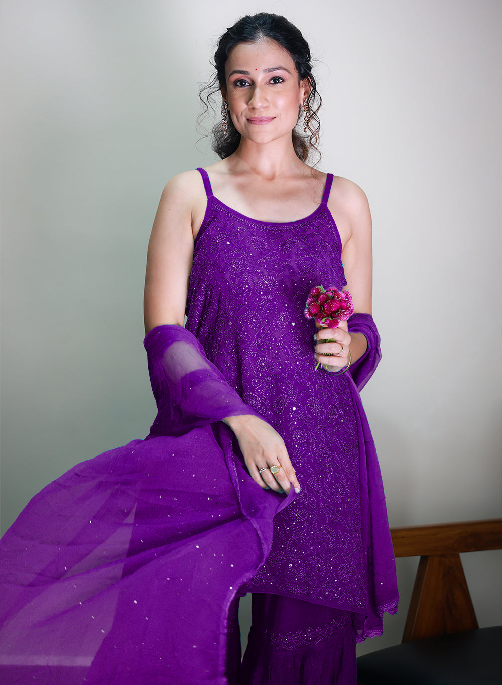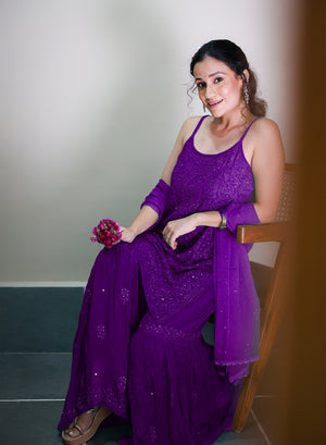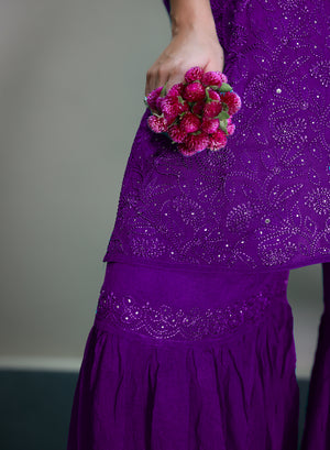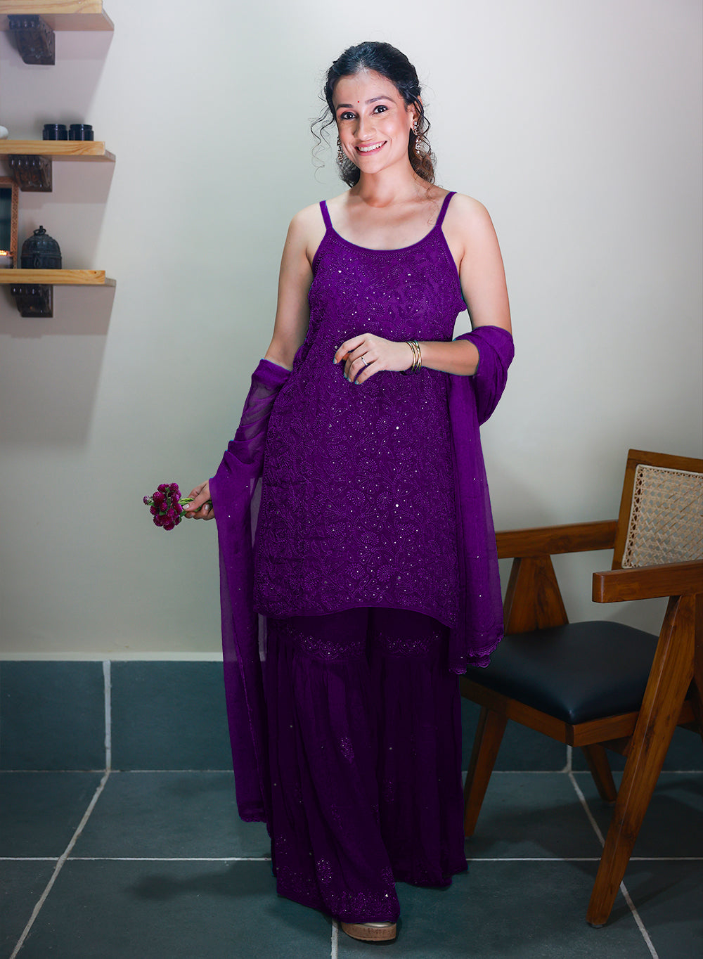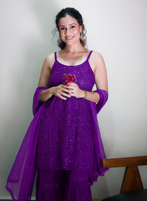 Kanak Purple - Nargis Viscose Noodle Strap Chikankari Kurta & Gharara Set