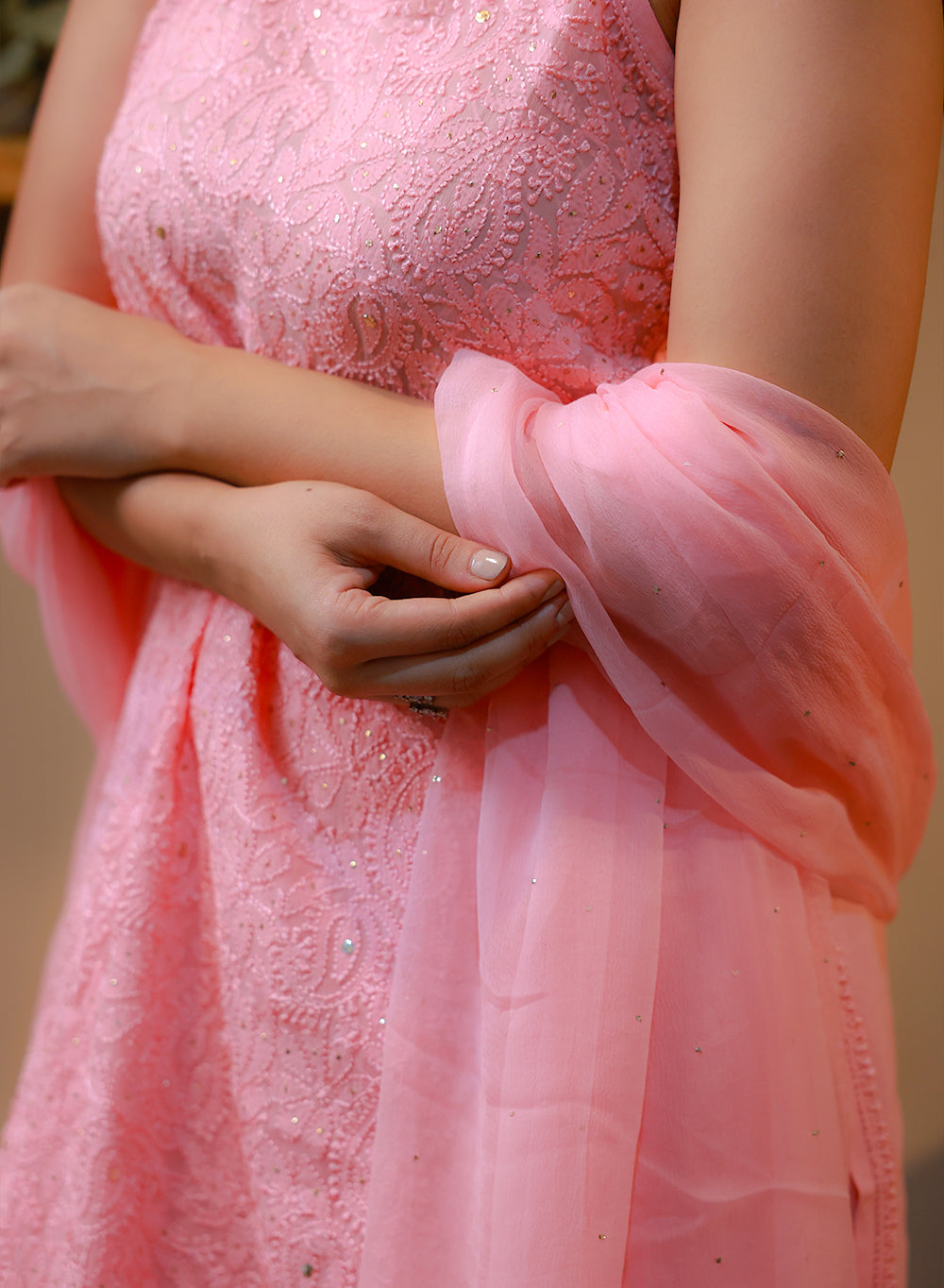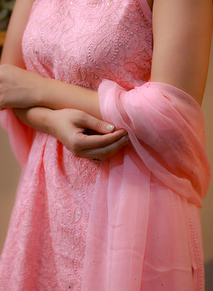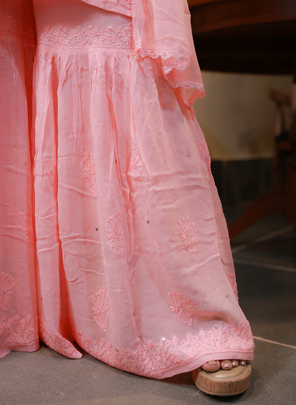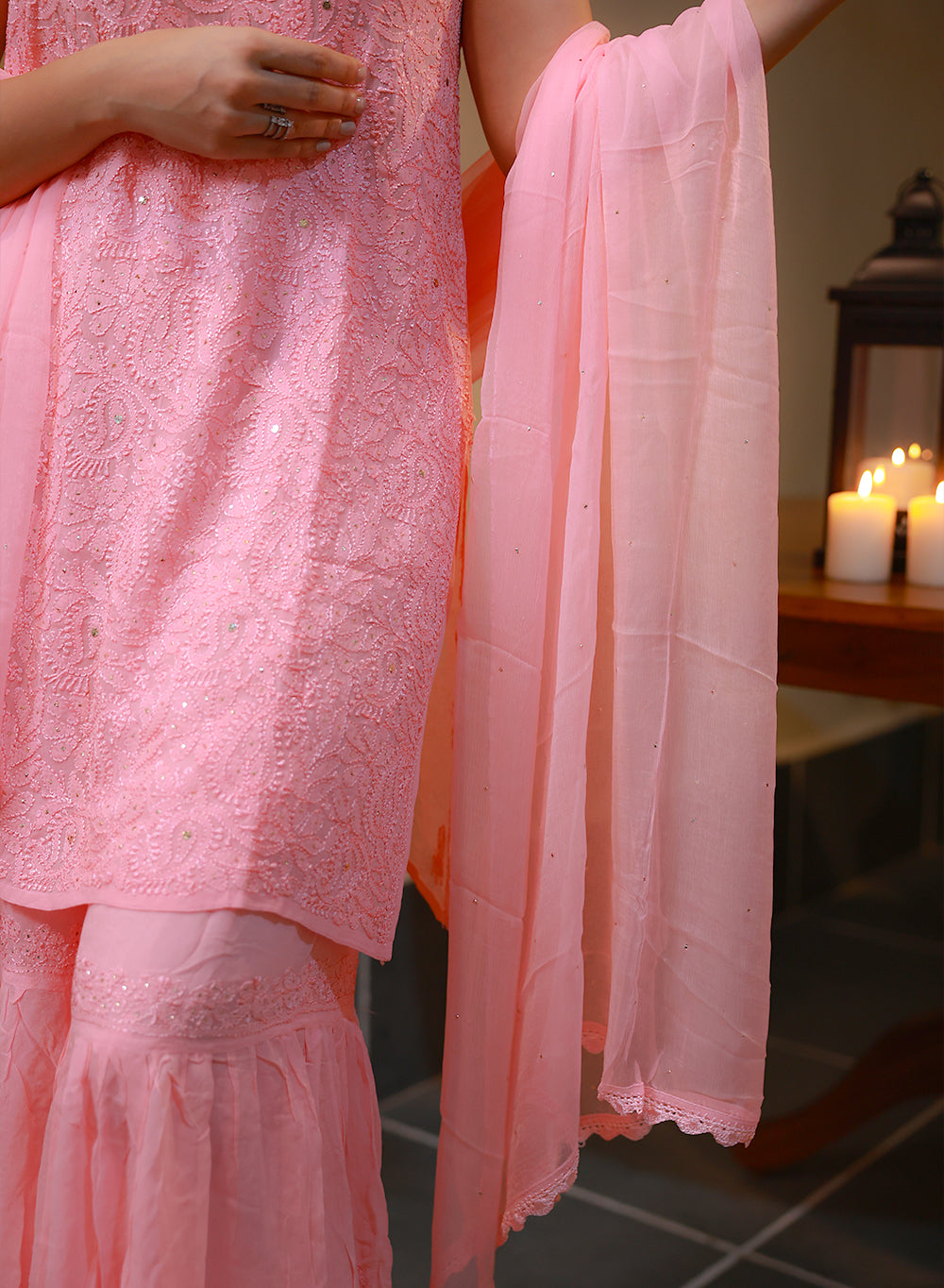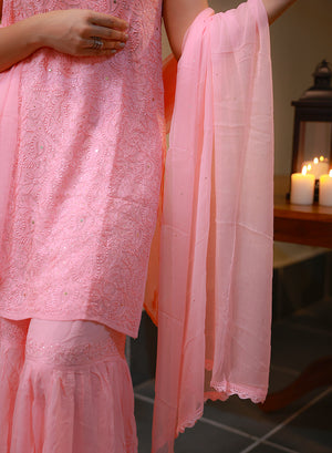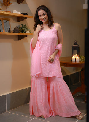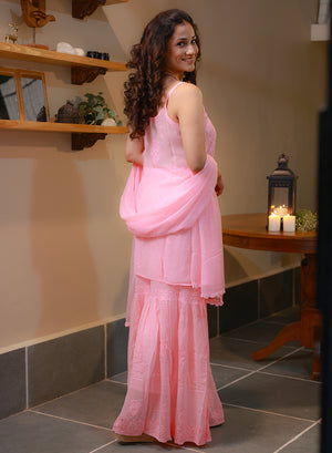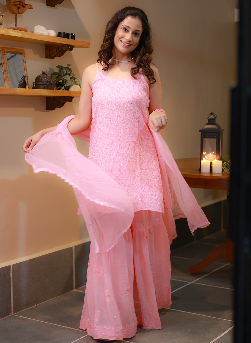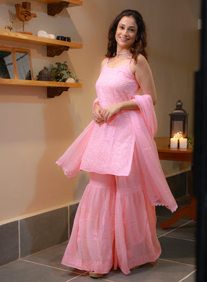 Kanak Pink - Nargis Viscose Noodle Strap Chikankari Kurta & Gharara Set
