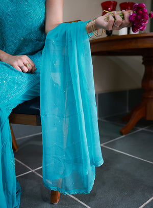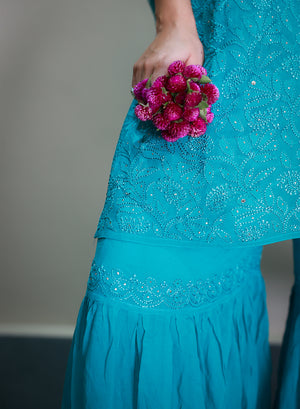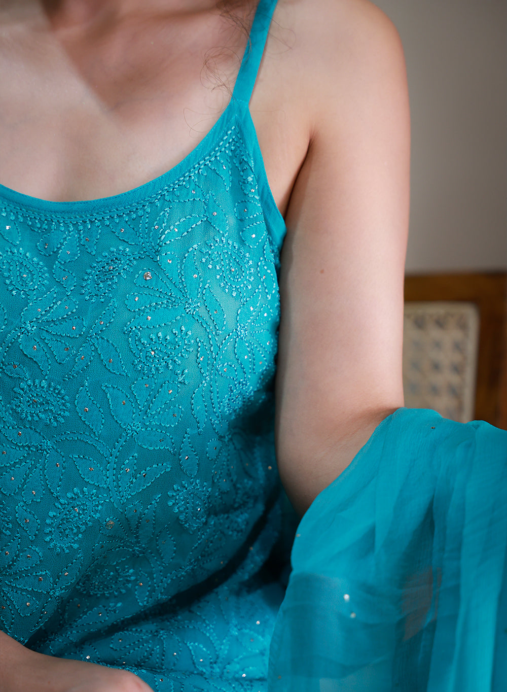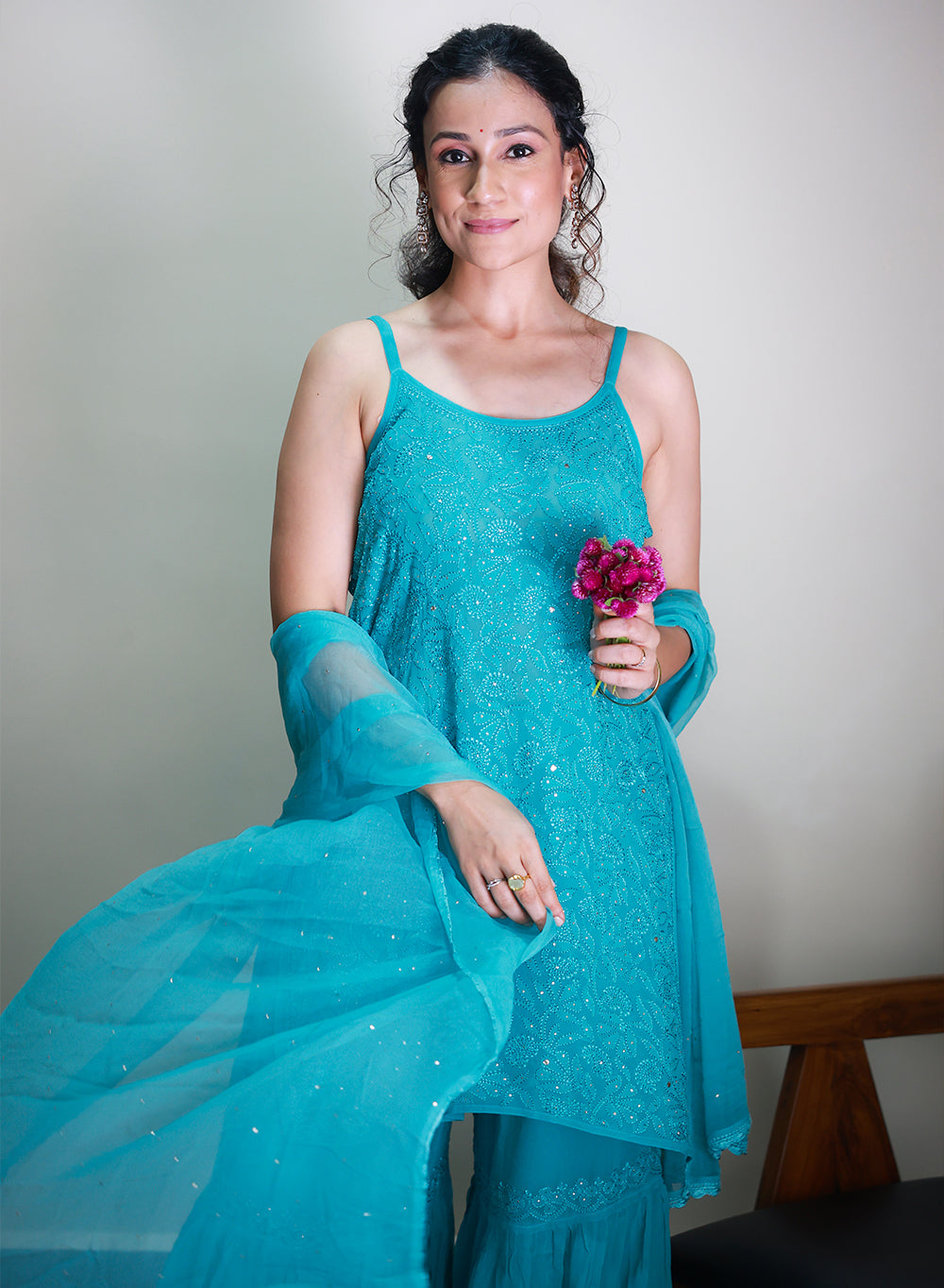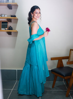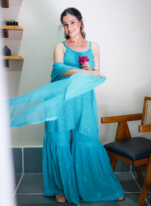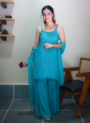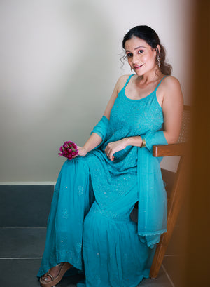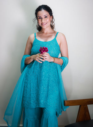 Kanak Turquoise - Nargis Viscose Noodle Strap Chikankari Kurta & Gharara Set