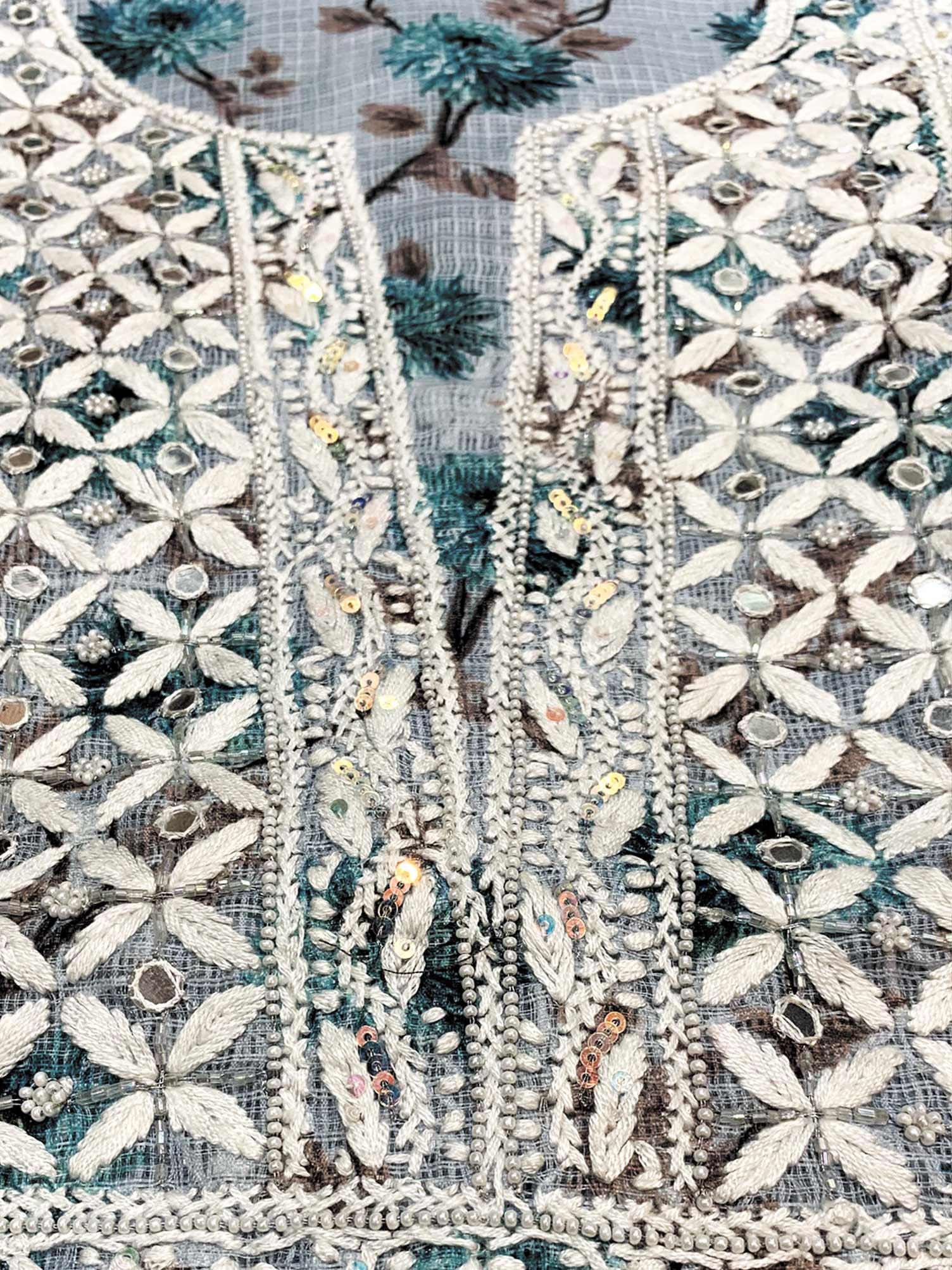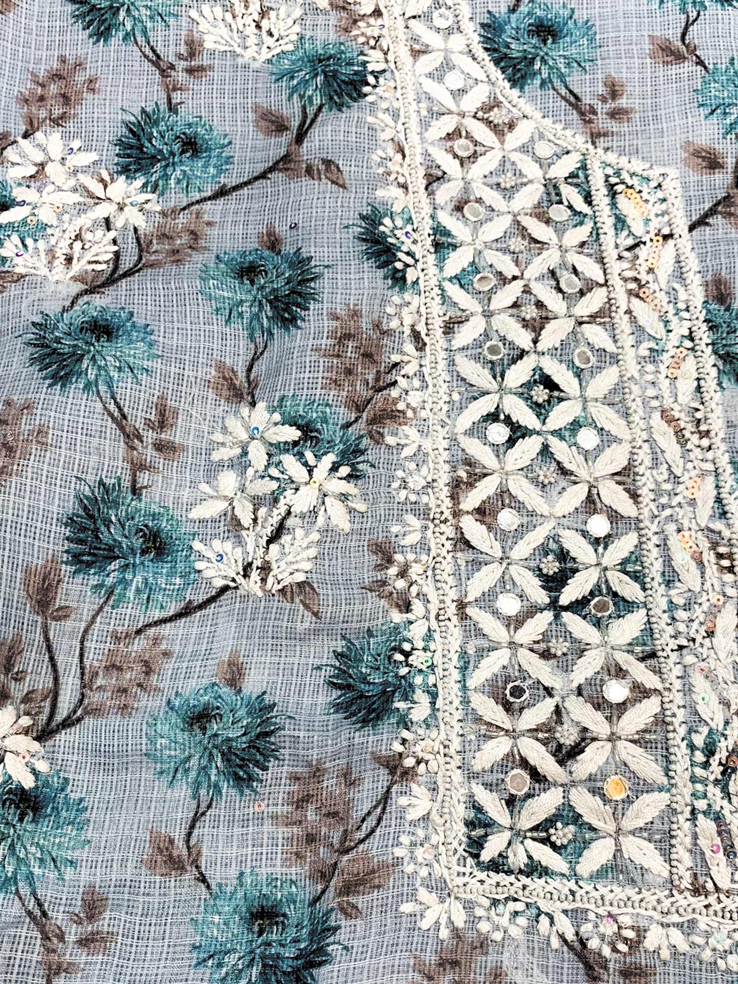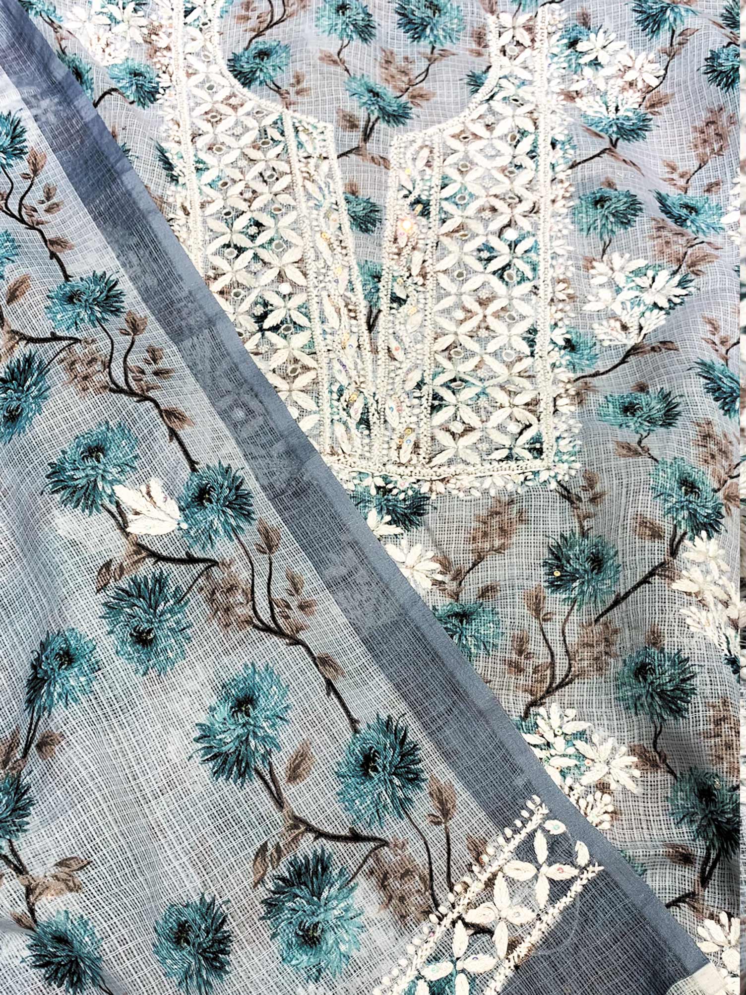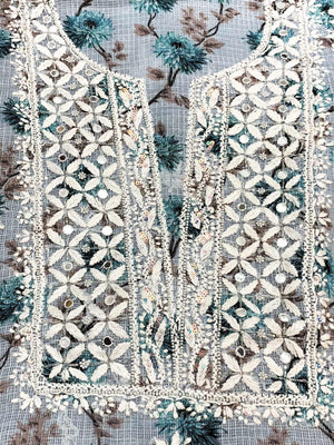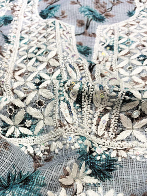 Our Light Blue Printed Kota Cotton full dress set has been hand embroidered with twisted cotton thread and embellished with beautiful sequins, pearls, katdana and mirror work.