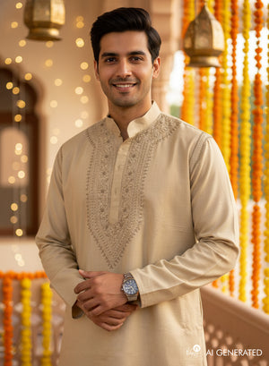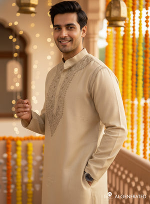 Presenting our exquisite Cotton Kurta from the prestigious Nawab collection, a true masterpiece of craftsmanship. Each piece is meticulously hand-embroidered with the finest cotton thread, embodying the grace and elegance of timeless tradition.