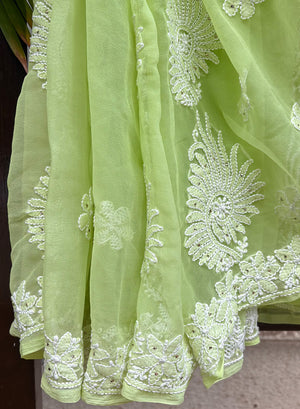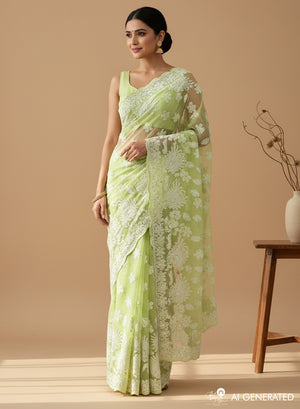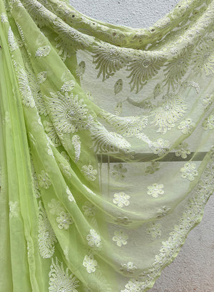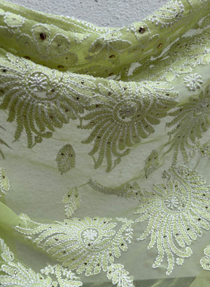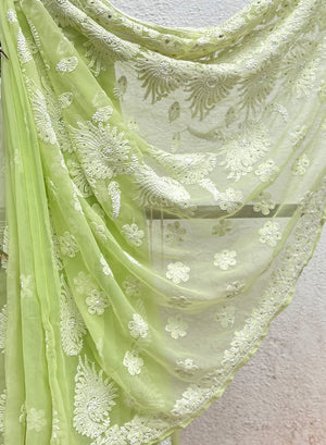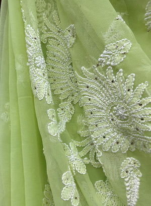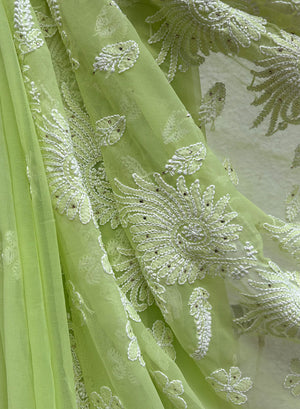 Light Green Mukaish - Aks Georgette Chikankari Saree