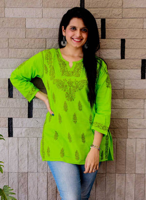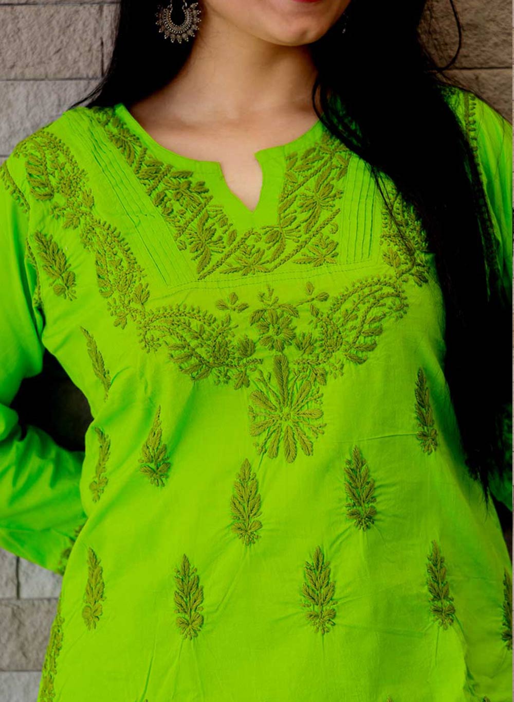 Parrot Green Checks - Gulshan Cotton Chikankari Short Top