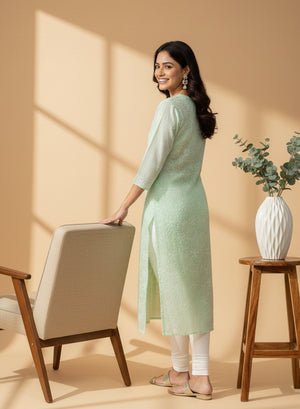 Our beautiful Mint Green - Bahaar Cotton Terry Voile Chikankari Kurta, has been hand embroidered with twisted cotton thread.